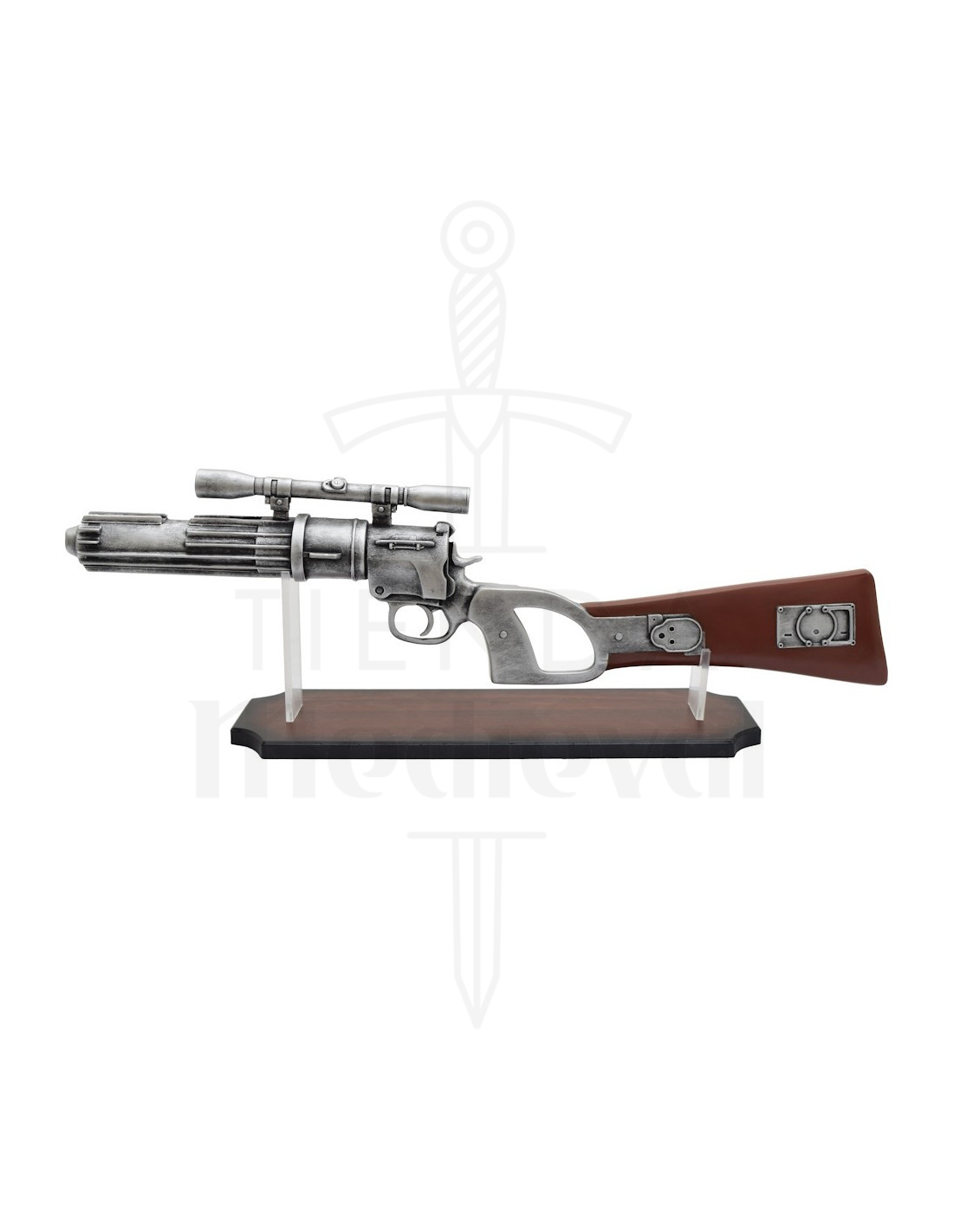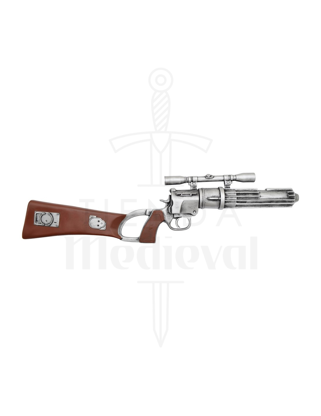 Ce fusil combine l'esthétique classique d'un revolver avec des touches futuristes, offrant une présence unique : le corps argenté avec cylindre et le long canon rayé apportent une atmosphère technique et détaillée, tandis que la lunette télescopique et la silhouette profilée créent une sensation d'authenticité cinématographique. La finition en résine de haute qualité permet des détails nets, pour que chaque texture et chaque plaque métallique se démarquent au premier coup d'œil.