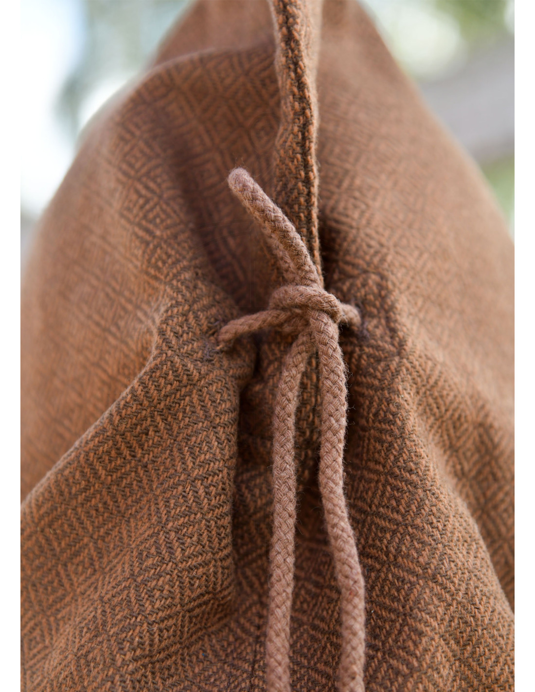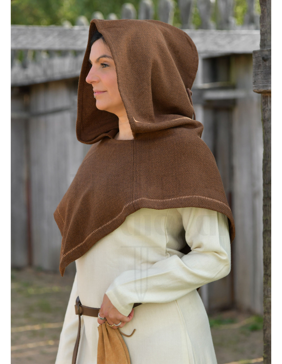 Cette capuche en laine marron transforme cette idée en réalité, offrant un confort naturel qui vous protège du vent et maintient la silhouette fidèle à des époques anciennes. Le tissu en chevron avec de petits losanges apporte une texture visible qui enrichit toute tunique ou cape, tandis que la finition en contraste rehausse les contours avec une finition élégante, parfaite pour ceux qui recherchent l'authenticité sans renoncer au style.