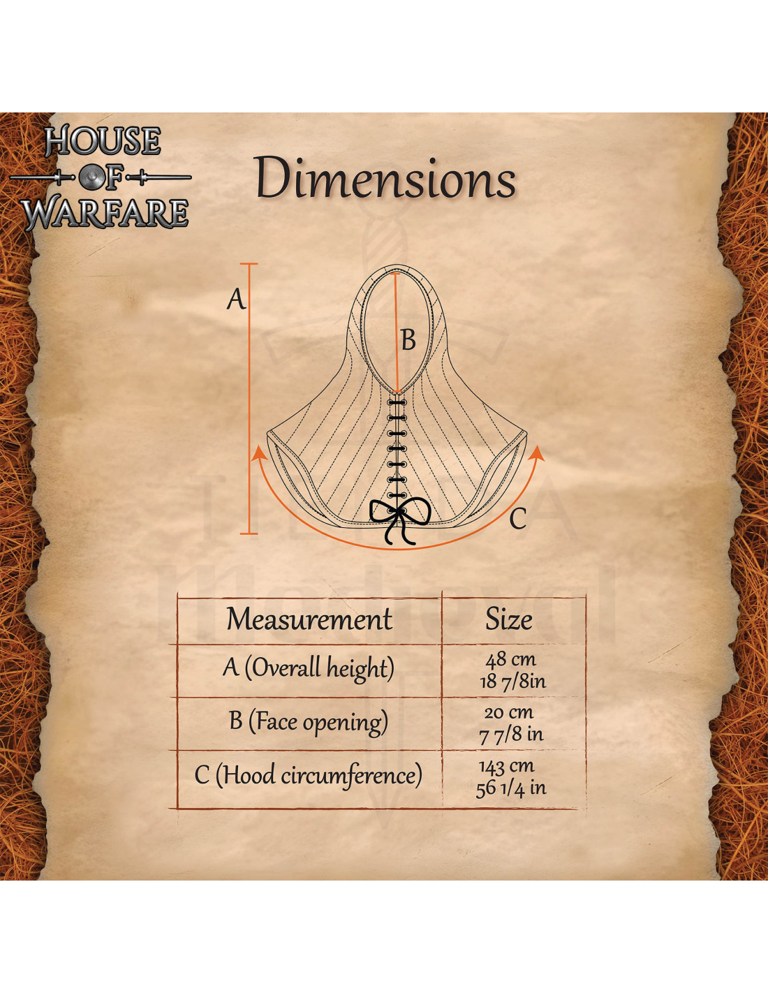 Cette pièce est particulièrement appréciée par les amateurs de LARP et par les professionnels du théâtre et de la reconstitution historique, car elle combine une esthétique fidèle aux XIIIe au XV siècles avec des fonctionnalités pensées pour l'usage moderne. À cette époque, des capuches rembourrées comme celle-ci étaient essentielles pour amortir les coups et éviter les frottements, un détail pratique qui reste très pertinent aujourd'hui.