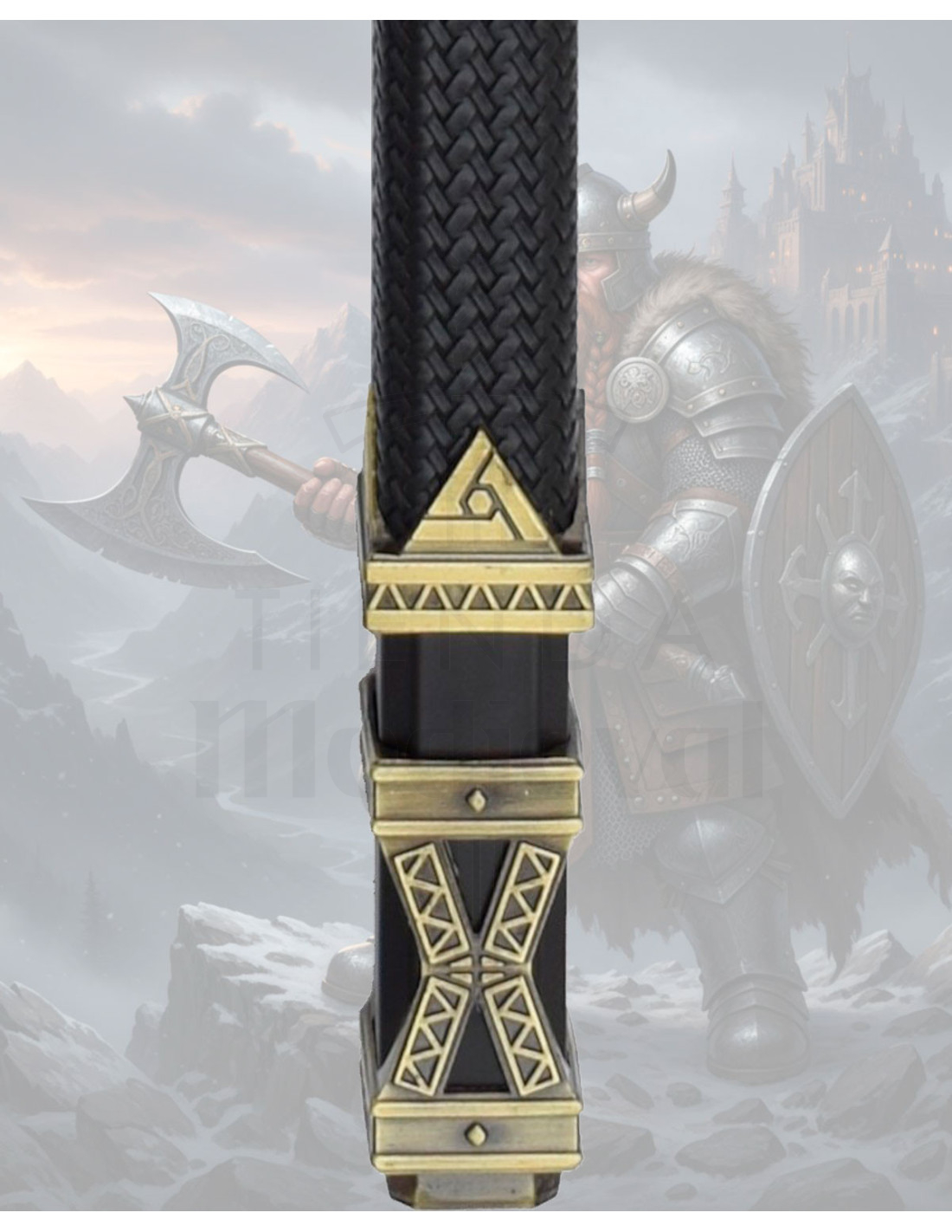 Le long et droit manche, avec une section supérieure en ton doré ou bronze et des reliefs détaillés, transmet la solidité et la fierté, tandis que la zone inférieure en noir avec texture en maille ajoute un contraste moderne et un point focal qui met en valeur l'esthétique globale. Les ornements métalliques gravés, tant près de la lame que sur la base, soulignent l’attention aux détails et élèvent la pièce d’objet de collection à œuvre d’exposition.