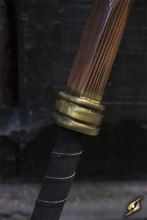 La longueur totale de l'arme est de 80 cm, avec un pommeau sculpté et une poignée gainée de cuir fendu de 25 cm, qui offre une prise en main ferme et confortable pour l'utilisateur. De plus, son poids de 400 grammes permet un maniement agile et précis lors des combats.