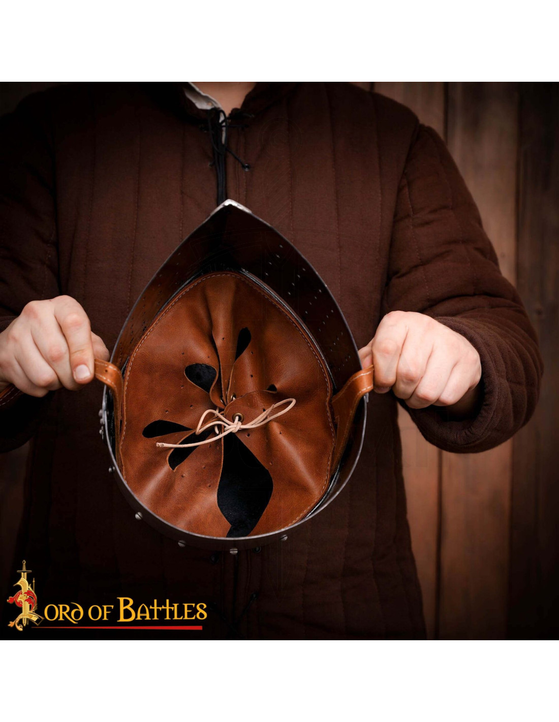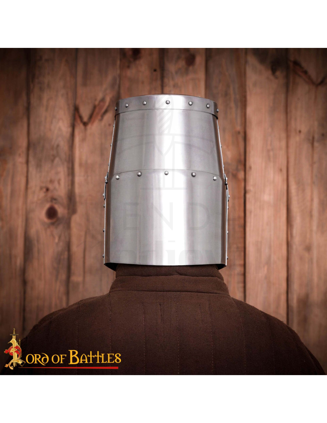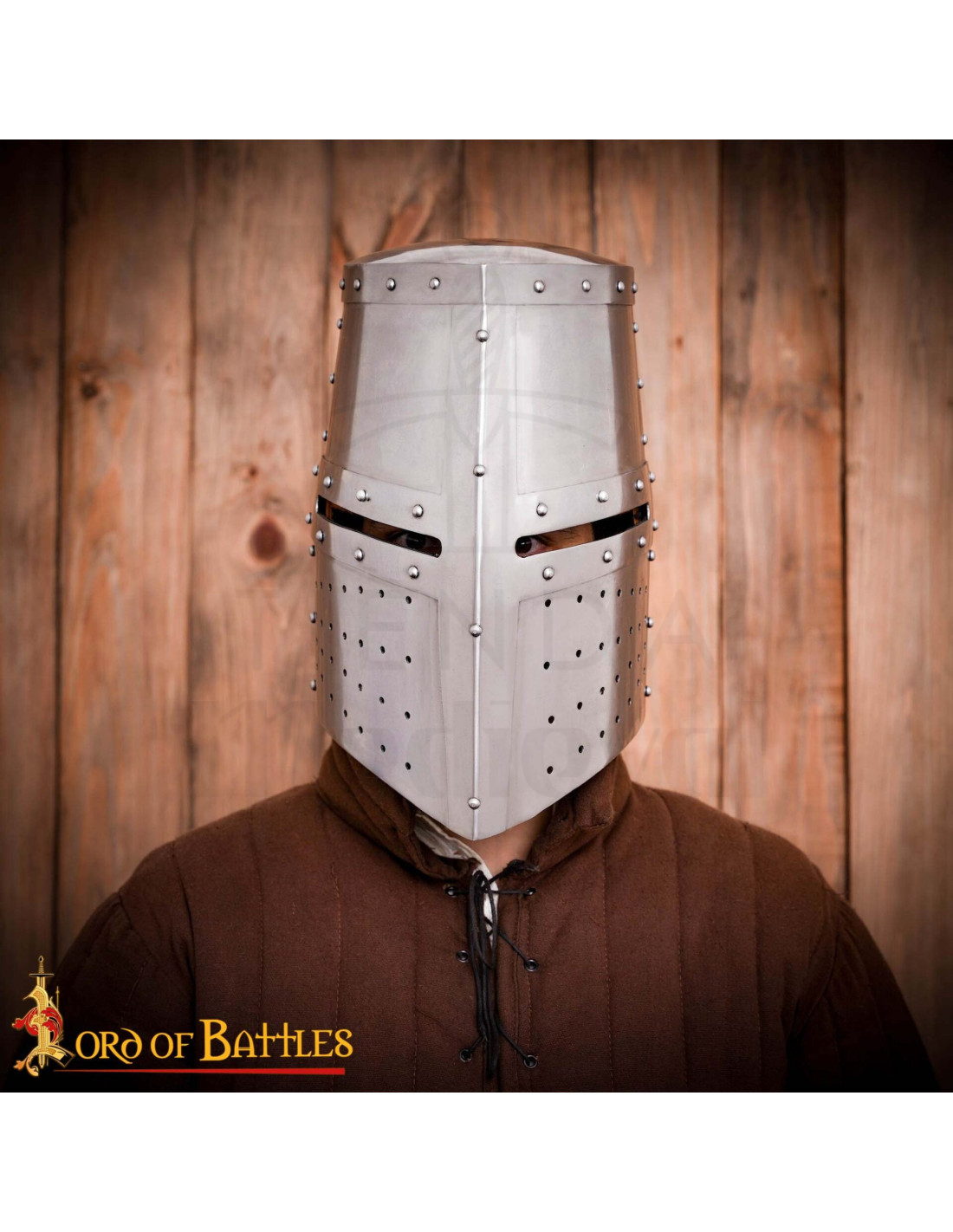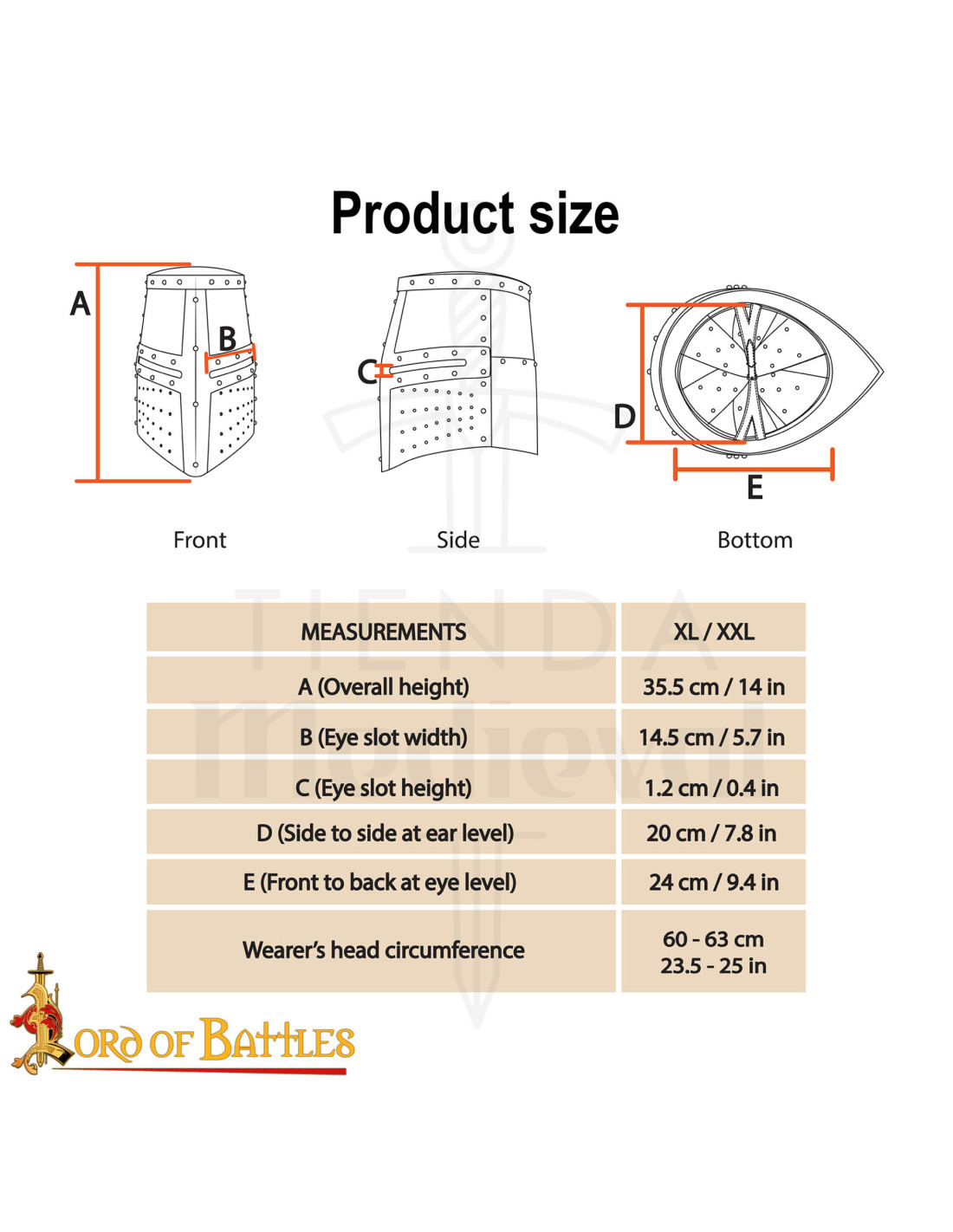 Son design inspiré des XIIIe et XIVe siècles couvre entièrement la tête, avec une structure permettant une vision claire à travers ses larges fentes oculaires, de plus de 14 cm de long, et une ventilation grâce à des perforations facilitant le confort lors de son port. Grâce à sa doublure en cuir, il s'ajuste parfaitement à votre tête, offrant confort et absorption des chocs lors du combat, tout en facilitant l'alignement de la vision.