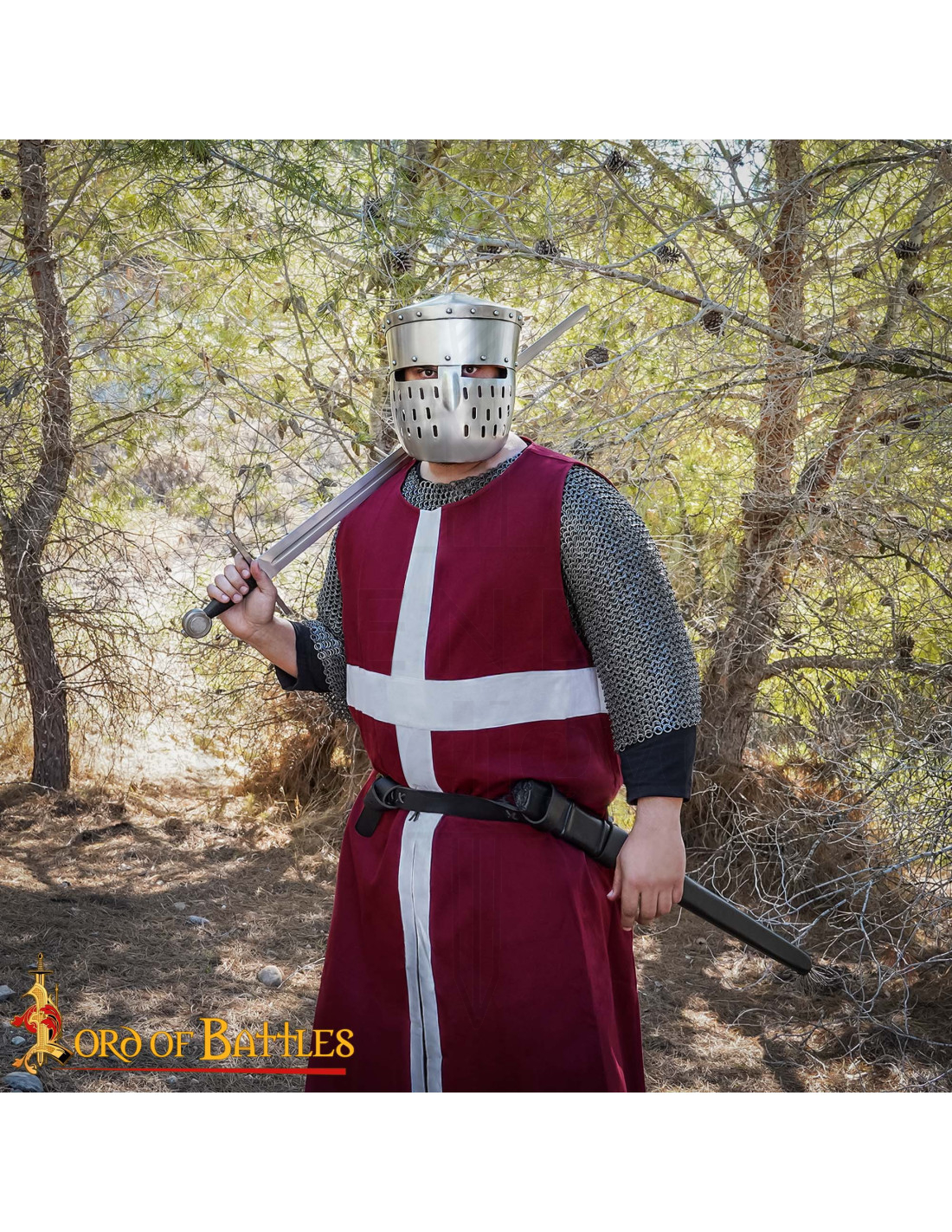 ¿Avez-vous déjà rêvé de vous sentir comme un véritable chevalier du Moyen Âge ? Ce casque de chevalier croisé vous transporte directement aux batailles du XIIIe siècle, vous offrant une protection légendaire et un style évoquant la bravoure et l'honneur des guerriers médiévaux. Fabriqué en acier résistant de haute qualité, sa finition polie et ses détails tels que les rivets classiques reflètent un artisanat authentique, garantissant une présence imposante et une durabilité à chaque aventure.