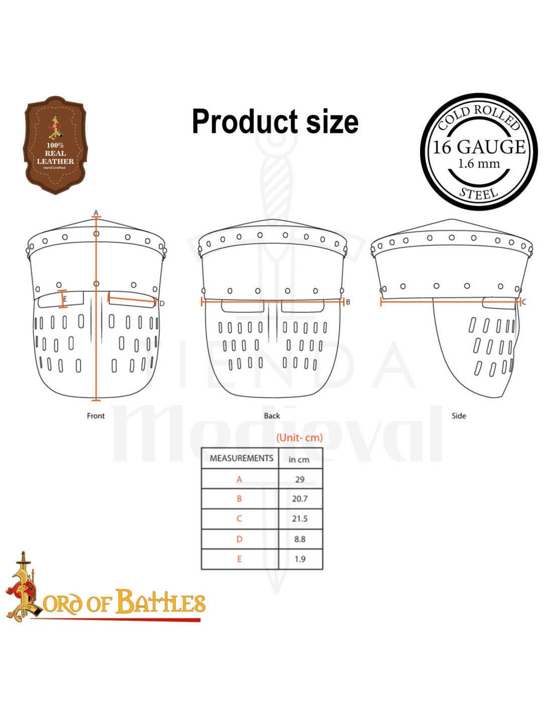 Avec un poids équilibré, ce casque s'ajuste confortablement à la tête des adultes, s'adaptant à différentes tailles avec une circonférence intérieure allant jusqu'à 68 cm. Parfait pour les reconstitutions historiques, le cosplay ou les expositions, il vous permet de vous connecter à l'histoire et de revivre l'esprit courageux des chevaliers croisés. De plus, sa finition avec une couche d'huile temporaire le protège contre la rouille, conservant son éclat et sa résistance avec le temps. Il suffit d'un chiffon sec pour le garder impeccable.