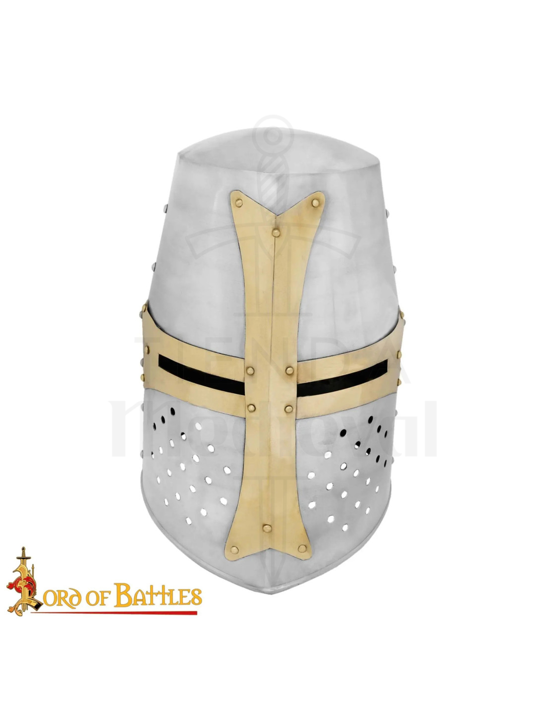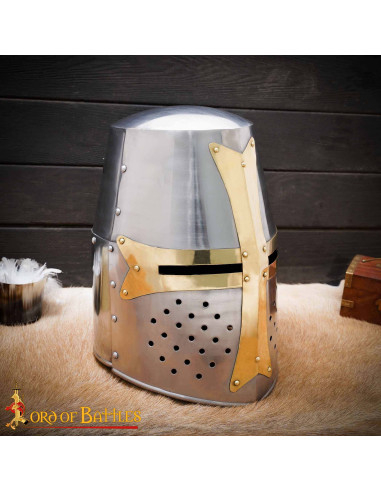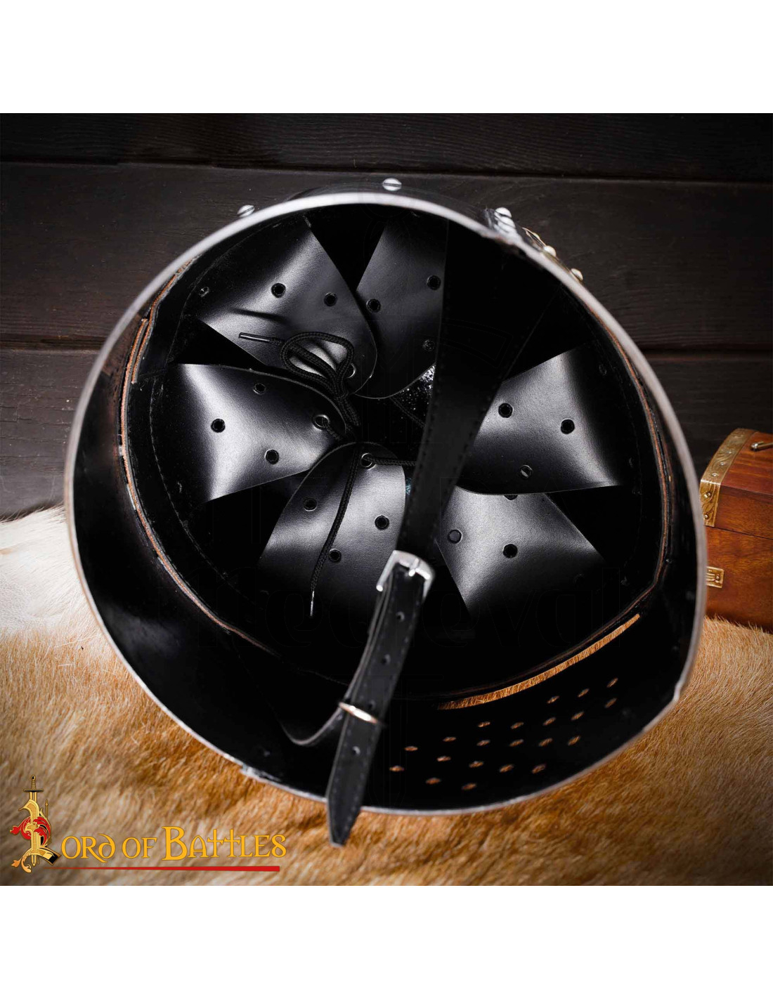 Son design cylindrique et ses perforations à l'avant garantissent une bonne ventilation, permettant de le porter confortablement lors de longues sessions ou reconstitutions. La croix en bronze colorée, rivetée solidement au centre, symbolise non seulement la noblesse et la protection divine, mais offre également un contraste visuel qui met en valeur son caractère historique.