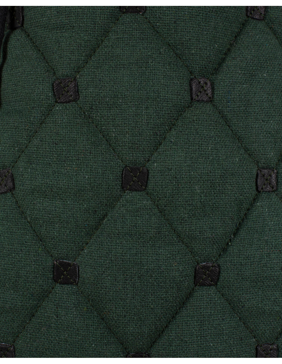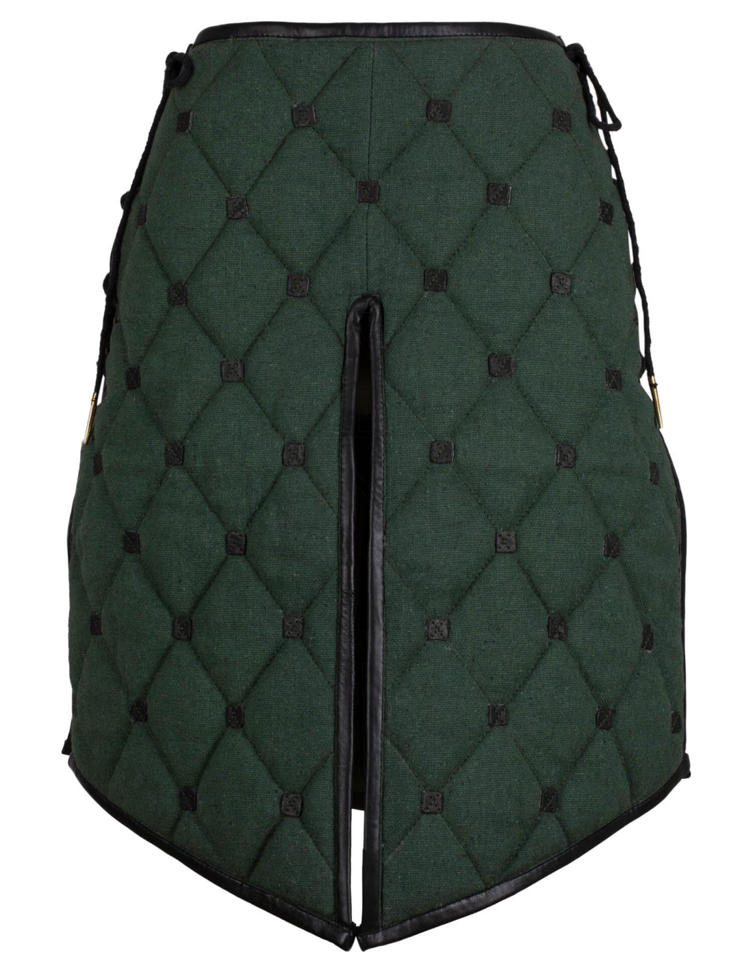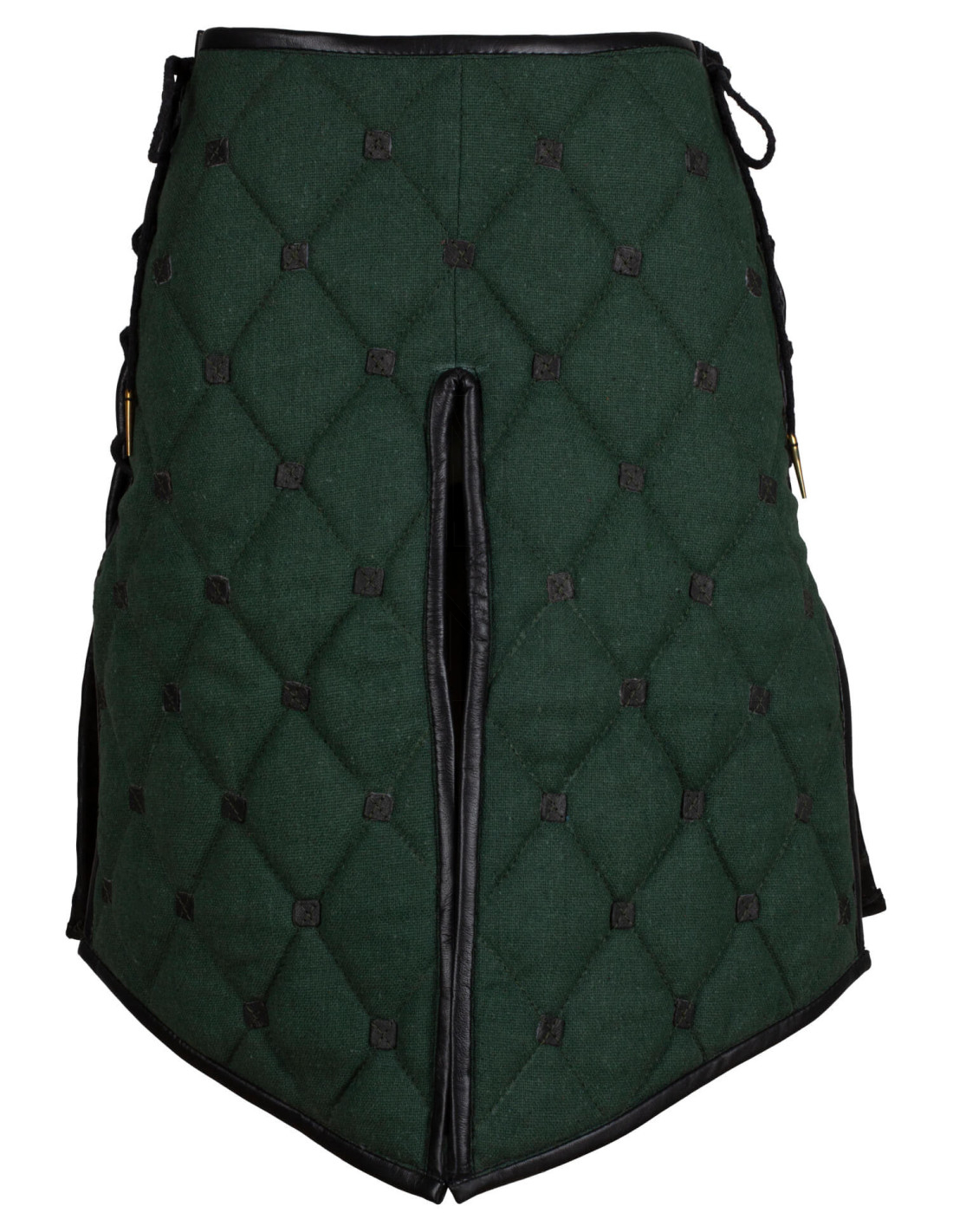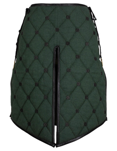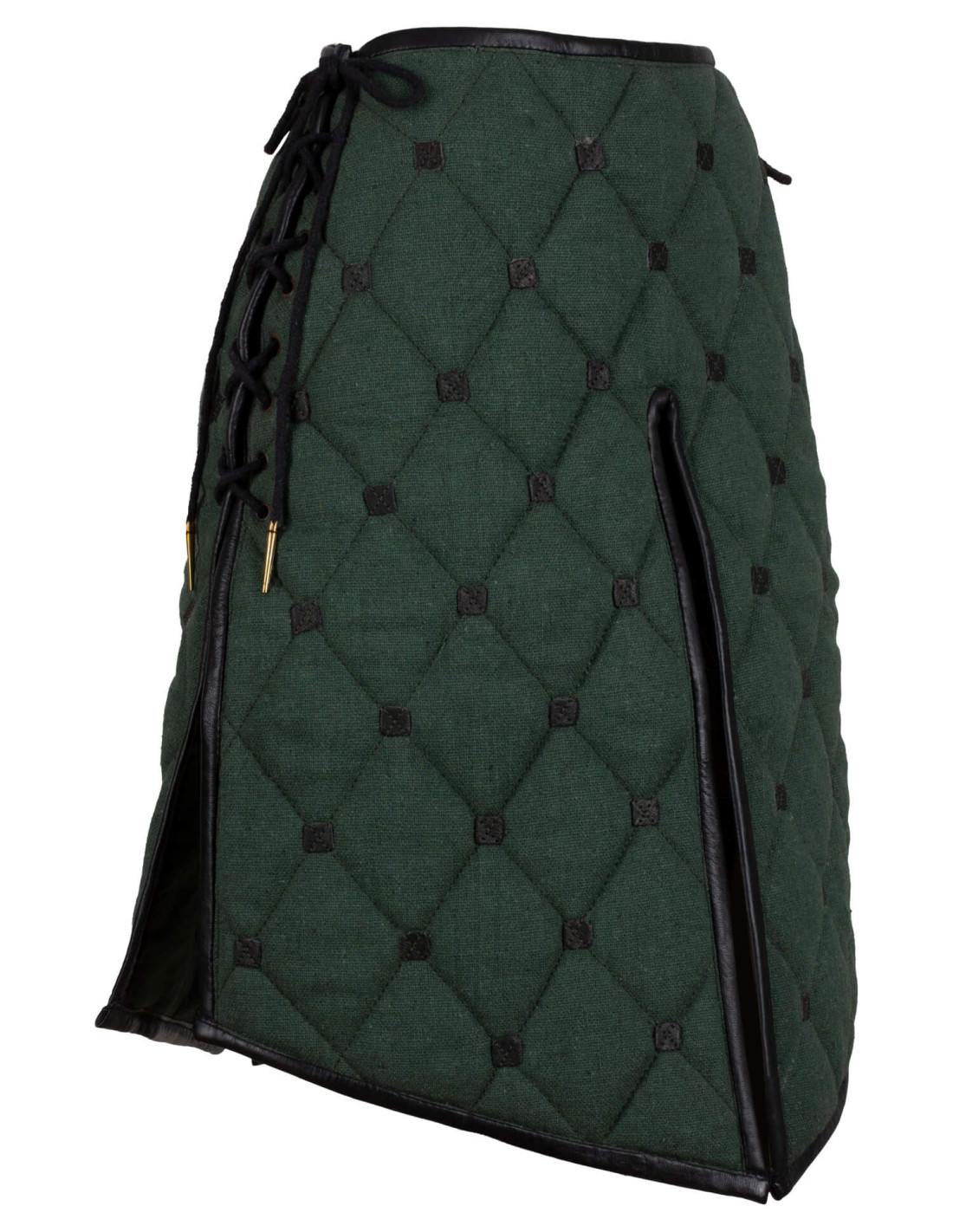 Prêt à renforcer votre style médiéval avec une touche de fonctionnalité ? Cette jupe gambeson du modèle Kovira, en vert foncé vif, est conçue pour vous accompagner dans toutes vos aventures. Grâce à sa finition matelassée avec motif en losange et ses détails en noir, elle allie résistance et style en une seule pièce.