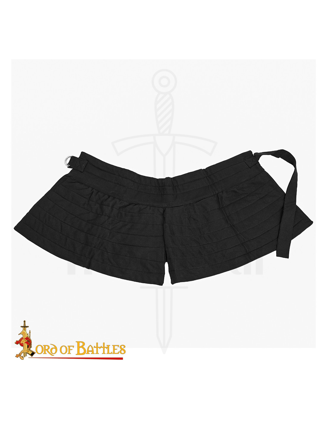 Le système enveloppant avec une longue bande et un anneau métallique permet un ajustement rapide et sûr, personnalisant le maintien pour qu'il ne bouge pas en combat. Le panneau frontal divisé augmente la mobilité, et la section rembourrée intégrée ajoute une protection supplémentaire pour la zone inguinale, utile que vous l'utilisiez seule comme pièce principale lors de combats légers, ou que vous la portiez sous des tassets en acier.