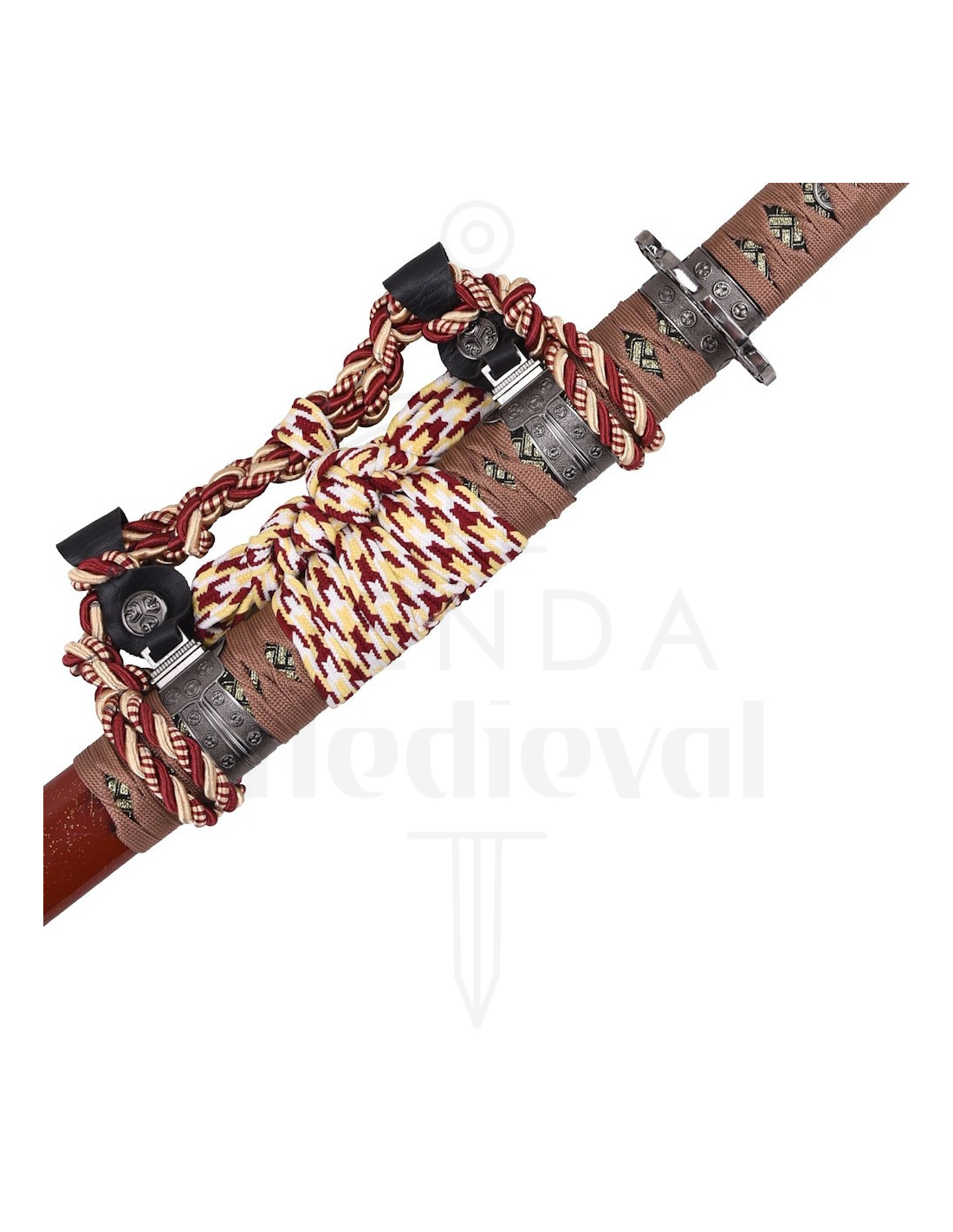 La saya décorée de cordes blanches, rouges et marron, et les garnitures métalliques, élèvent la pièce à un ensemble harmonieux, facilitant son placement en tant que centre d'attention dans un bureau, un salon ou un bureau. Les détails enroulés à la bouche de la housse et à ses extrémités rappellent la tradition, offrant à la vue une finition cohérente et appréciée par les collectionneurs et les amateurs de style japonais.