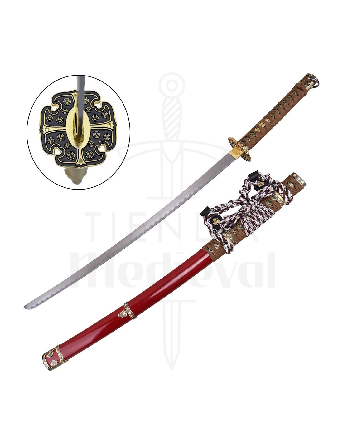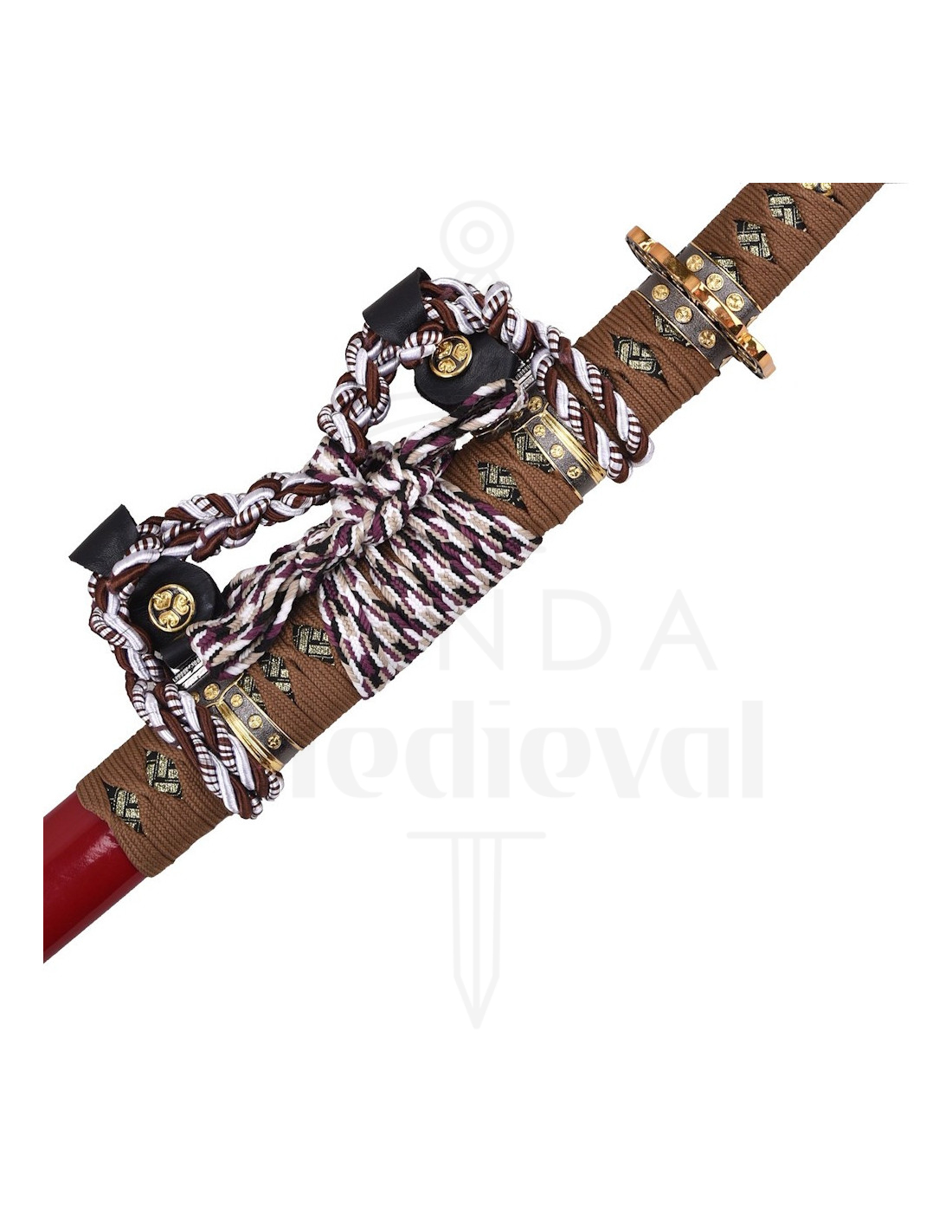 Le garde-main petit avec décoration dorée et noire fonctionne comme détail focal, apportant élégance et continuité avec les finitions métalliques de la gaine. La gaine en rouge brillant, terminée par des pièces dorées et ornée d'un nœud tressé en blanc, noir et marron, ajoute contraste et dynamisme, transformant la katana en un objet décoratif qui s'harmonise avec des styles classiques et modernes.