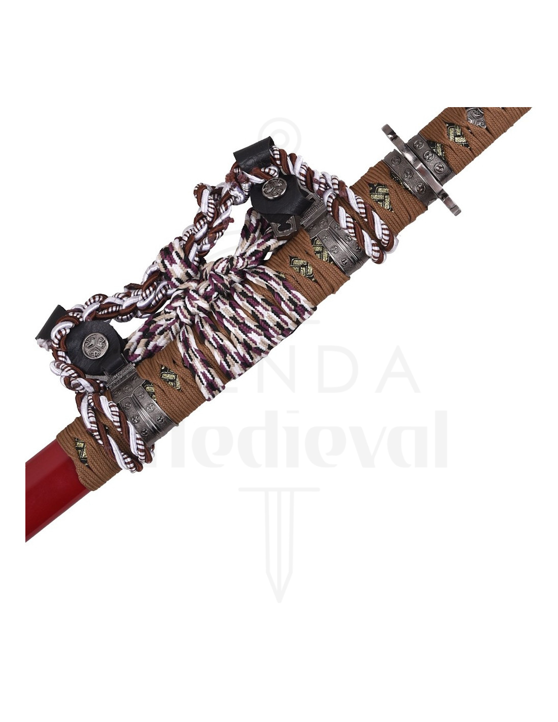 Le fourreau rouge brillant, décoré de quincaillerie et de cordons en blanc, marron et noir, transforme la pièce en un élément décoratif prêt à être exposé ; les cordons noués non seulement embellissent, mais permettent également de l'accrocher ou de la sécuriser avec style. Si vous souhaitez acheter la Katana décorative traditionnelle japonaise cordon marron-blanc argent, vous choisirez une œuvre qui équilibre esthétique et fonctionnalité pour exposer ou offrir.