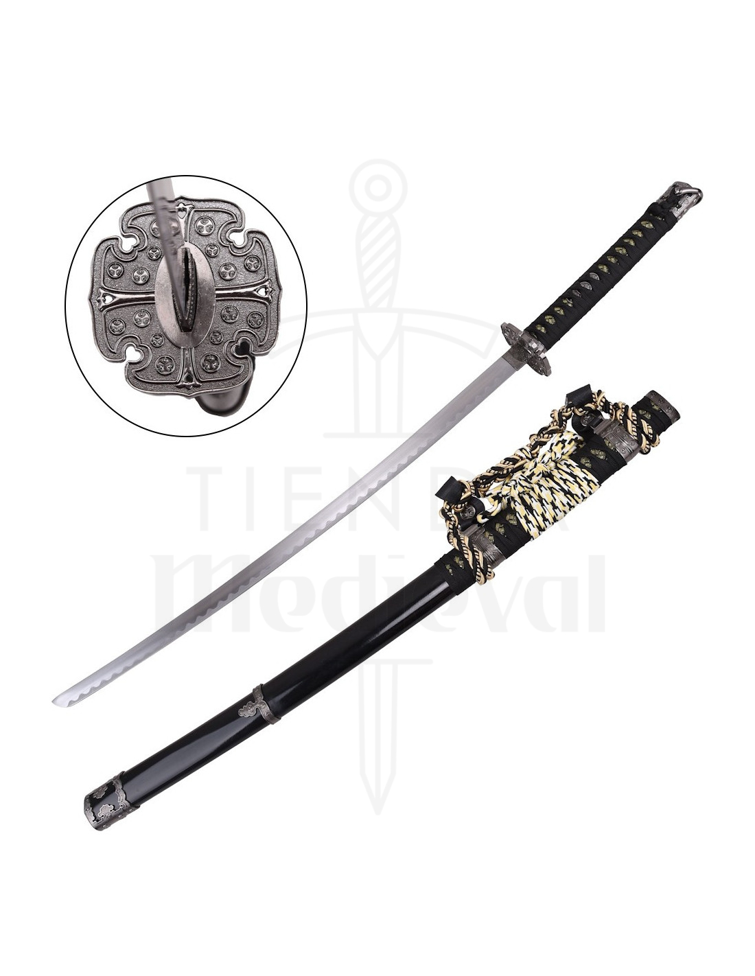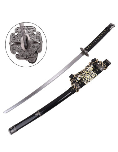 Katana décorative japonaise traditionnelle noire, détails en argent
