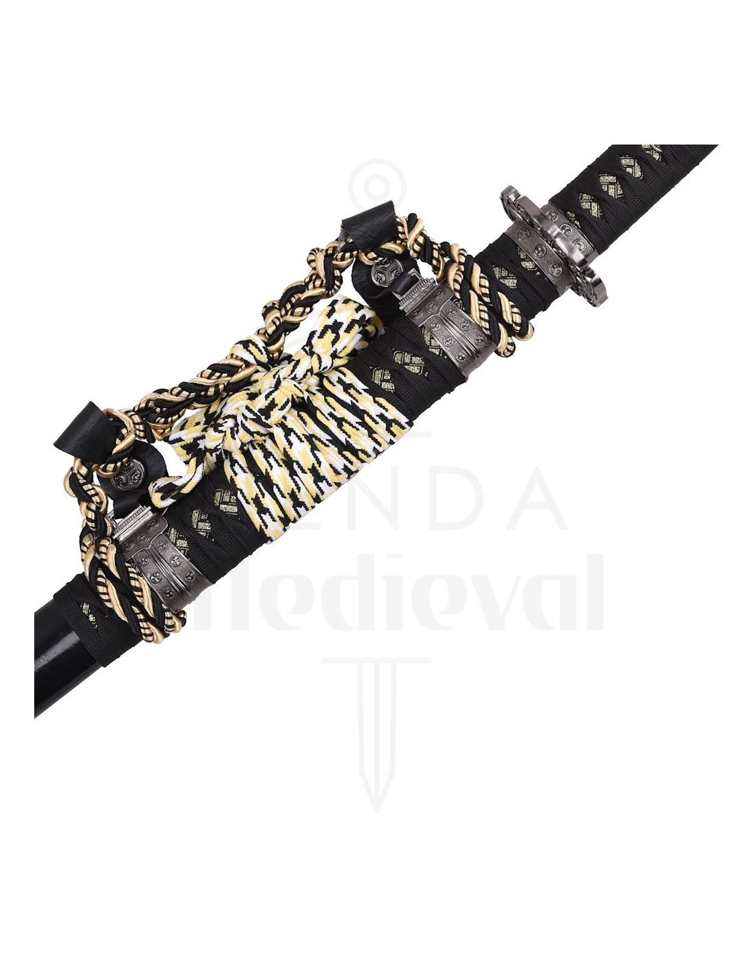 La garde métallique, ornée de symboles et de formes symétriques, ajoute une touche de distinction, transformant la katana en un élément décoratif chargé d'histoire, tandis que son design orné renforce son élégance sans renoncer à la cohérence visuelle.