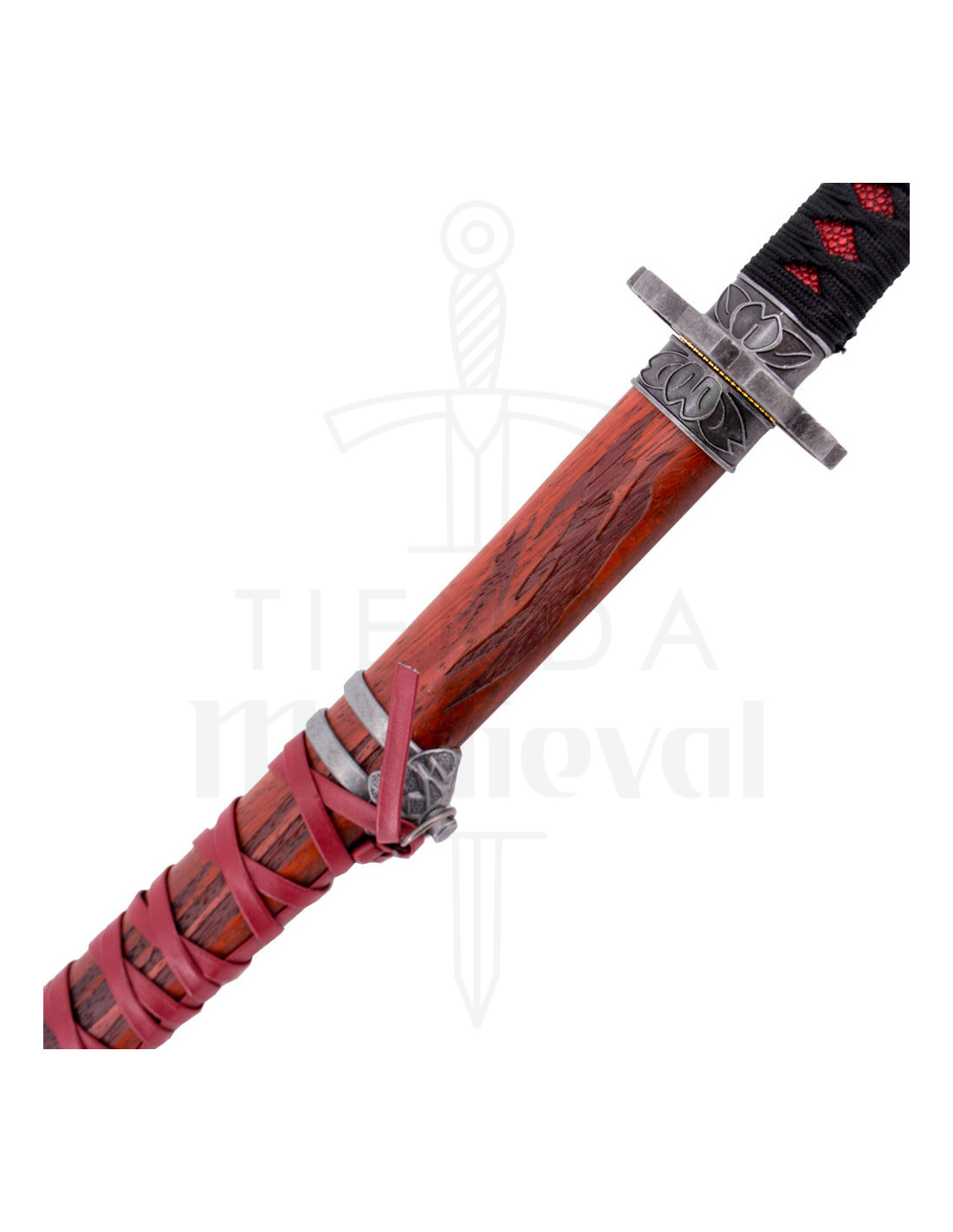Le manche lacé en noir, avec imitation de peau de raya rouge, assure une prise ferme et confortable, tout en se distinguant par ses détails esthétiques, évoquant la tradition japonaise. Le lacage, caractéristique des katanas de haute qualité, garantit un contrôle optimal, tant en exposition qu’en utilisation pratique.