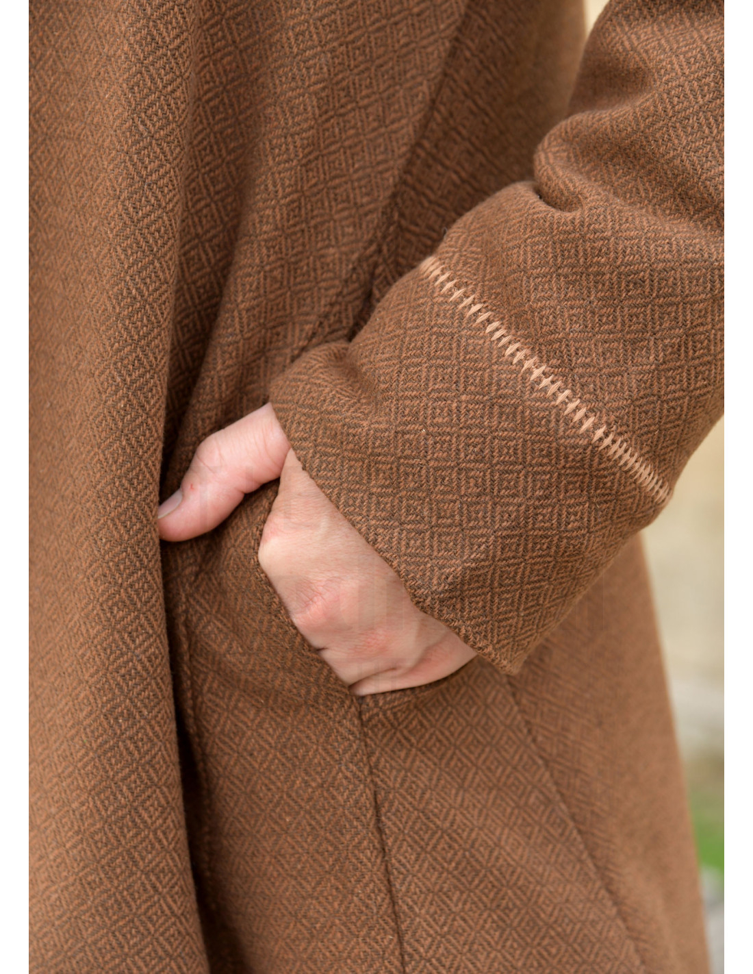 Les renforts sur les côtés créent une chute plus large en bas, permettant une liberté de mouvement et un vol élégant en marchant, idéal pour se déplacer naturellement lors d'événements en extérieur. Les poches discrètes, intégrées à la hauteur des hanches, vous laissent les mains libres pour des outils, des cartes ou de petits objets, sans rompre la silhouette historique.