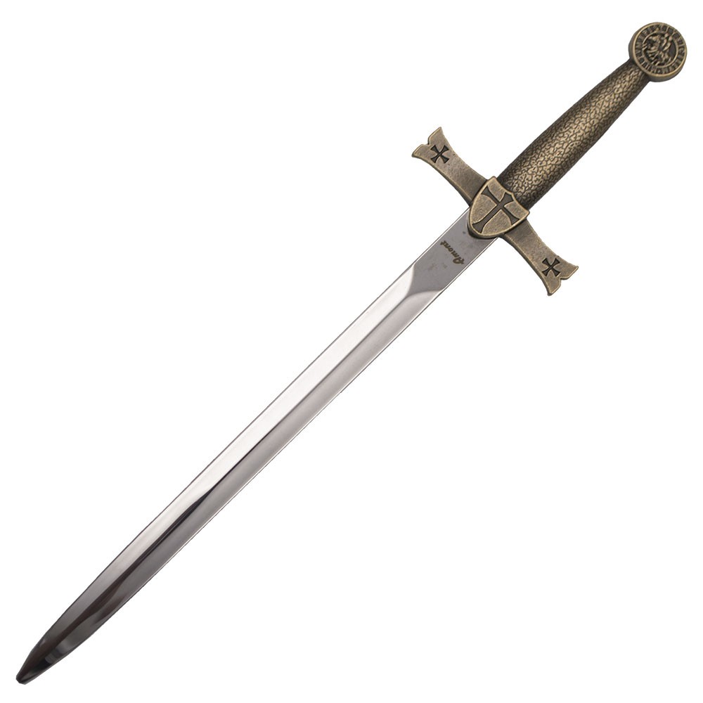 Les épées maçonniques de l'Épée des Templiers II avec le pommeau, la garde et la poignée en couleur bronze. La taille totale est de 21 cm et est livré présenté avec un blister. La lame en acier est de 420.