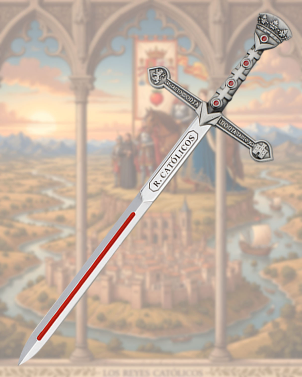 Cette pièce ornementale brille d'un éclat argenté rehaussé de détails rouges qui créent un contraste élégant et frappant. La lame, longue et droite, présente une bande rouge centrale qui guide le regard vers l'inscription verticale 'R. CATOLIQUES', un détail qui ajoute du caractère et une authenticité historique. Le garde-main, en forme de croix, a des gravures fines tout au long de ses bras, apportant une ambiance symétrique et raffinée, tandis que le pommeau décoré d'incrustations rouges termine la pièce avec un accent visuel qui harmonise avec la poignée.