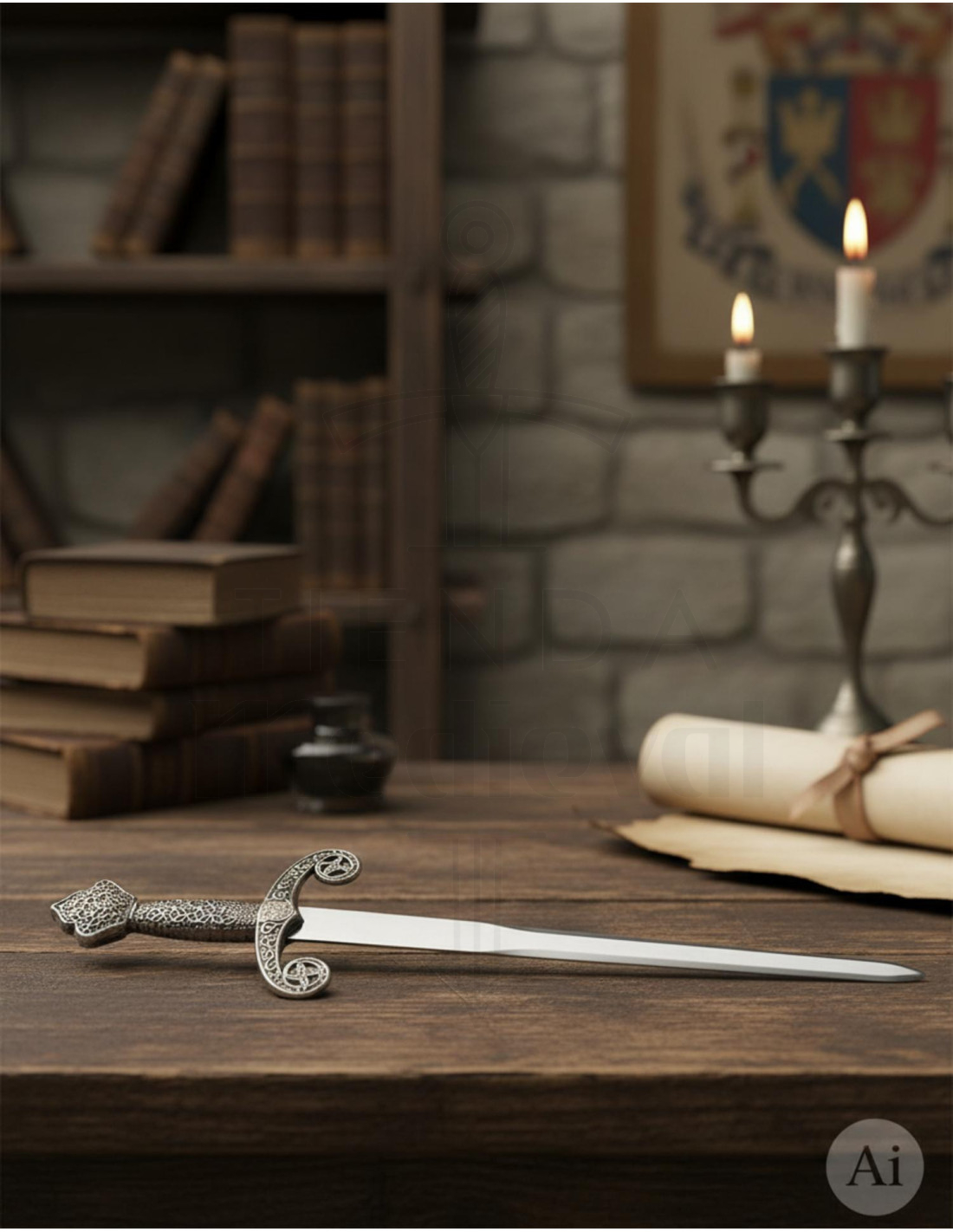 Ouvre-lettre Alphonse X. Imitation de l'épée d'Alphonse X en taille ouvre-lettre avec lame en acier inoxydable. C'est un joli détail à avoir dans notre bureau, ou à offrir en cadeau.