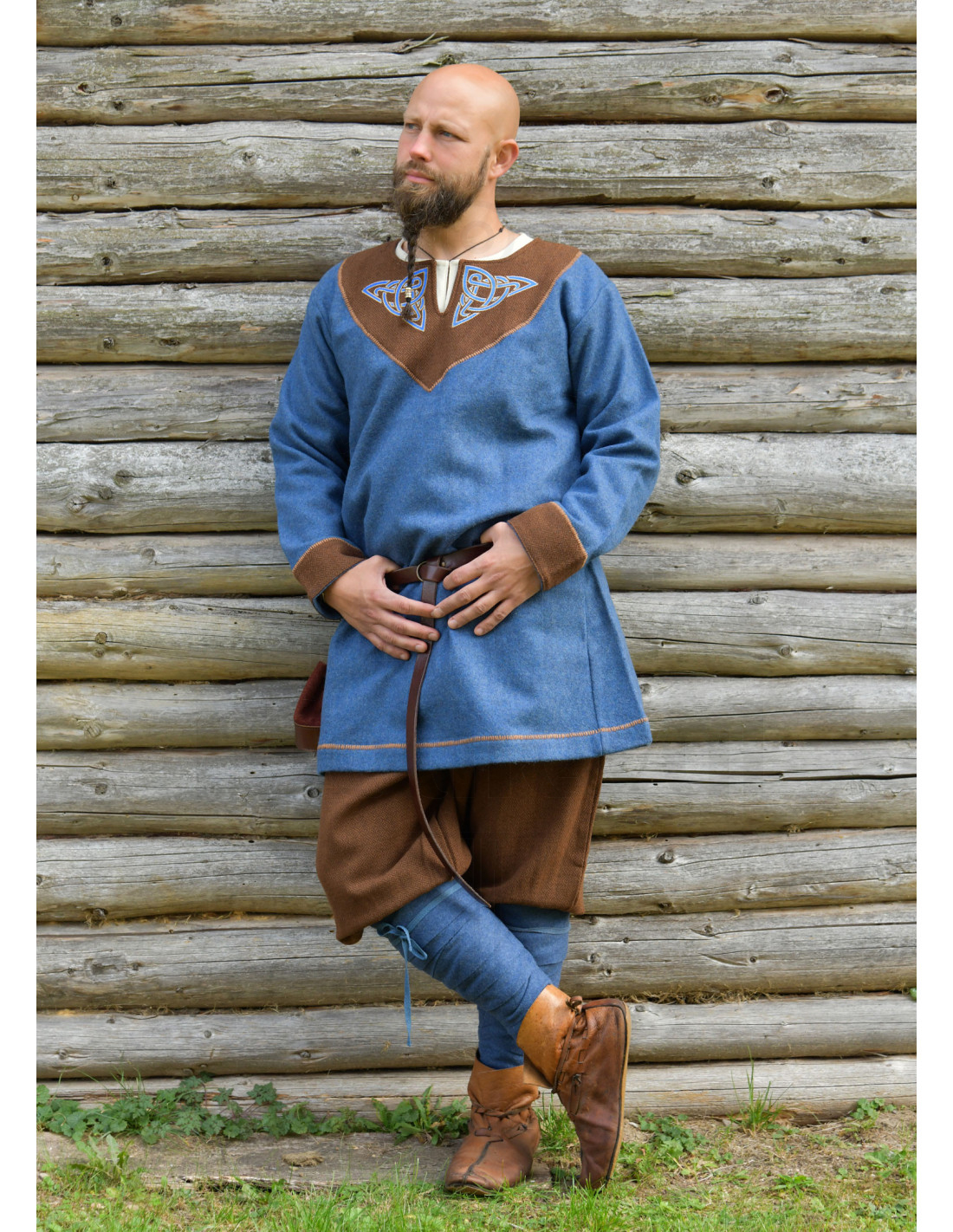 Ces vêtements trouvent leurs racines dans la tradition des Rus' vikings, liée aux voyages et aux établissements scandinaves en Europe de l'Est entre les VIIIe et XIe siècles. Des motifs iconographiques, comme les pierres de Gotland, montrent des variations similaires de pantalons amples, renforçant l'authenticité du design.