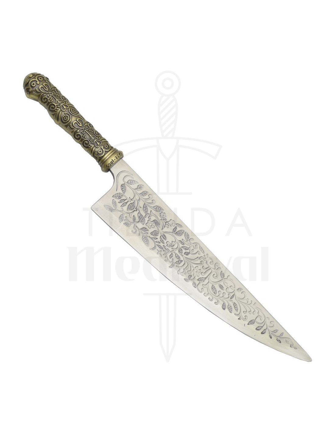 Le manche, avec une finition métallique qui rappelle le bronze ancien, offre une sensation robuste et travaillée au toucher, grâce à ses reliefs décoratifs qui continuent le langage floral de la lame. Cette esthétique soignée apporte caractère et cohérence visuelle, idéale pour ceux qui recherchent des pièces avec présence et personnalité.