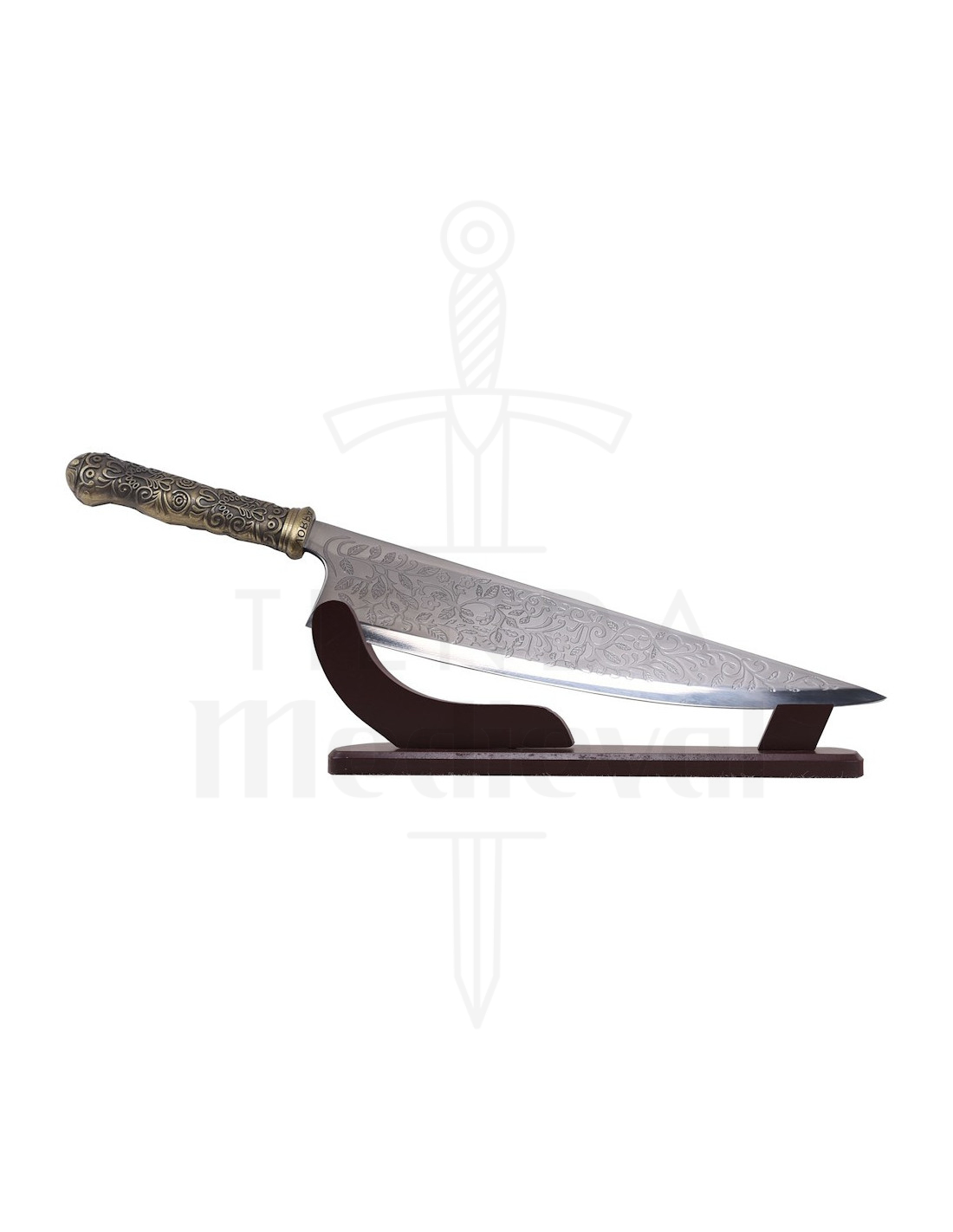 Elle inclut un socle en bois pensé pour l'exposition, qui facilite l'affichage de la pièce avec sécurité et élégance, sans nécessiter des montages compliqués. De plus, la lame n'est pas aiguisée, donc elle est conçue exclusivement pour l'ornementation, offrant une tranquillité d'esprit si vous souhaitez la placer dans un espace accessible.