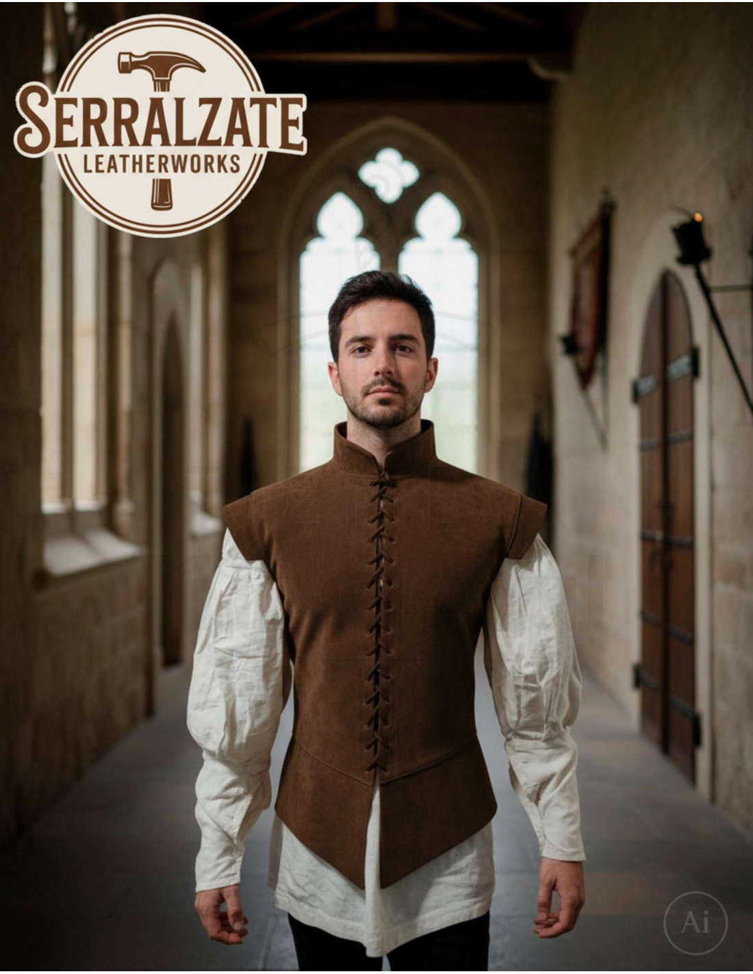 Ce jubón fusionne tradition et fonctionnalité, fabriqué en cuir suédé authentique qui apporte une texture douce au toucher et une résistance pensée pour vous accompagner en multiples occasions. La confection artisanale et le système de fermeture avec des lacets en cuir rehaussent non seulement son esthétique, mais facilitent également un ajustement confortable et personnalisable, idéal pour ceux qui apprécient à la fois le style et la praticité.