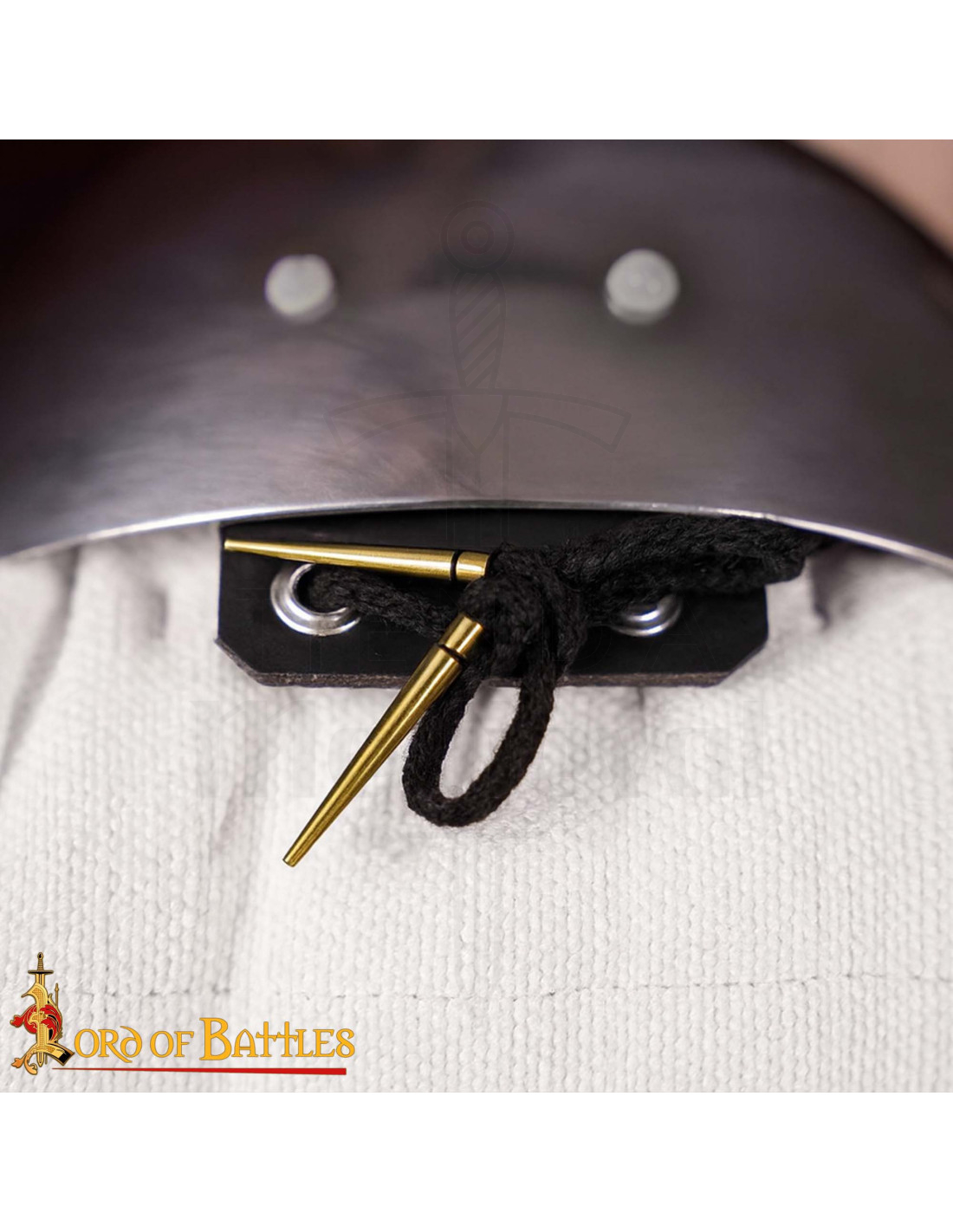Sur l'image, vous pouvez voir les cordele noirs avec des pointes métalliques dorées allongées et légèrement étroites avant leur finition, une forme qui assure la fixation au tissu et facilite le passage par des œillets et des passants. Bien que le set contienne cinq unités, l'aspect visuel rappelle des séries utilisées dans des reconstitutions, car le laiton poli apporte ce soupçon d'authenticité qui se distingue dans les contextes LARP et de reconstitution historique.