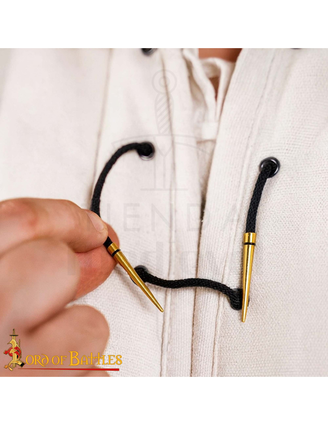 Historiquement, les pointes métalliques protégeaient non seulement l'extrémité du cordele, mais servaient aussi d'accent décoratif qui complétait la tenue, une tradition qui conserve sa valeur esthétique et fonctionnelle aujourd'hui. Si vous recherchez à acheter le Set de 5 cordele en coton médiéval avec embouts en laiton, vous trouverez dans ce produit la combinaison de praticité et de fidélité visuelle exigée par la mode d'époque.