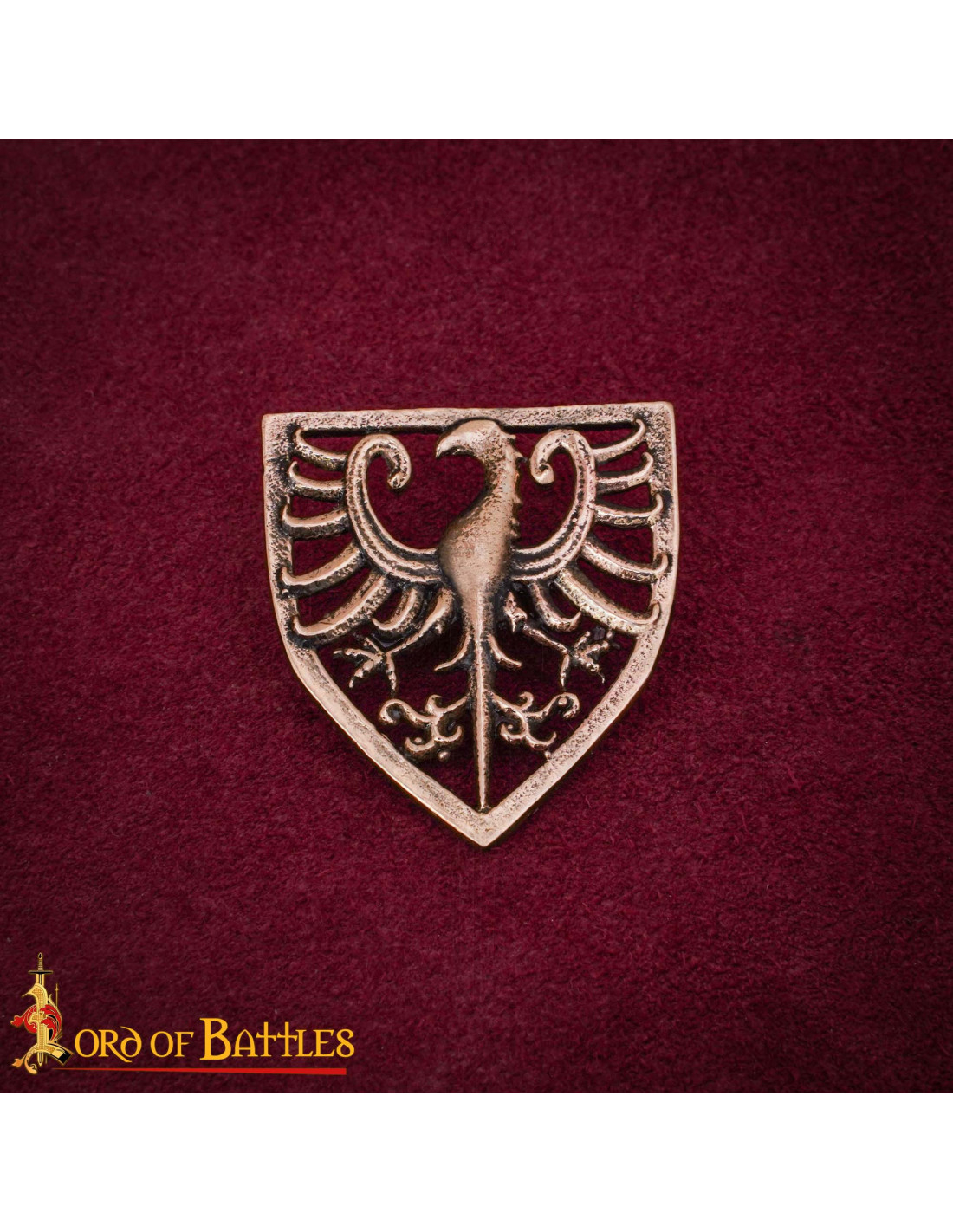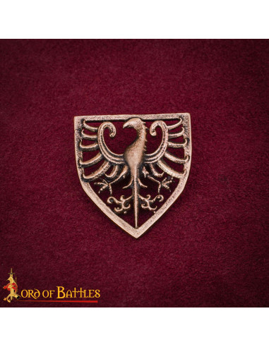 La technique artisanale utilisée permet un niveau de détail qui se perçoit au toucher et à la vue, avec des contours définis et une texture qui rappelle les boucliers et bannières médiévales. Le résultat est un ornement qui ne semble pas fabriqué en série, mais forgé par des mains expertes pour conserver la force visuelle de l'héraldique occidentale du XIIIe siècle.