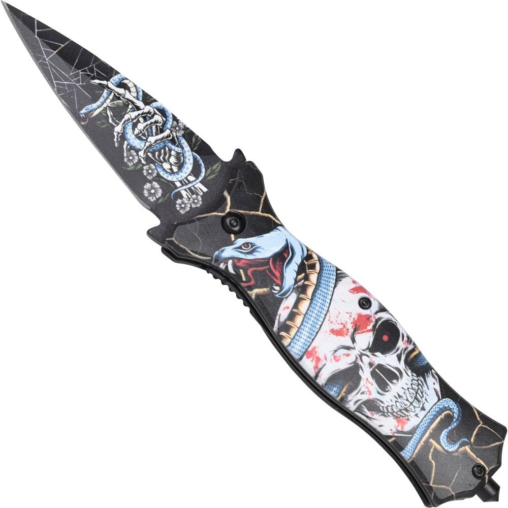 Nous vous présentons le couteau Stiletto Nightmare III avec une pointe brise-verre, un outil qui se distingue tant par sa fonctionnalité que par son design spectaculaire. Ce couteau de poche attire tous les regards, avec sa lame et son manche décorés des deux côtés, ce qui lui confère un style unique et accrocheur.