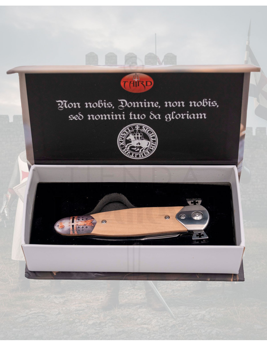La virole en acier avec croix, polie jusqu'à obtenir un éclat miroir, apporte un point de distinction qui transforme chaque utilisation en une petite cérémonie. Le manche en bois de hêtre offre une surface chaude et lisse qui s'adapte confortablement aux doigts, tandis que l'impression 3D recrée le casque templier, apportant un relief tactile qui accentue la prise sans renoncer à l'élégance.