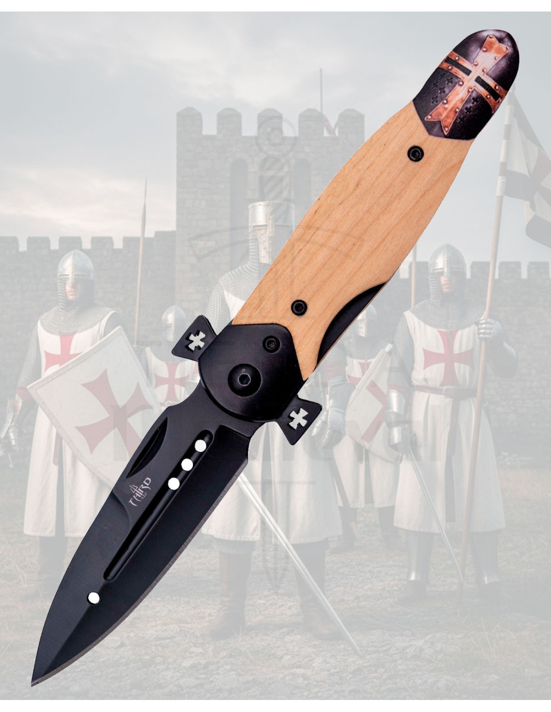 Le sommet avec des croix sur la virole et le détail supérieur qui réplique des éléments templiers élèvent la valeur esthétique du couteau, en faisant une pièce idéale pour les collectionneurs. Il est livré dans un coffret de présentation, prêt à être offert ou à être rangé avec style.