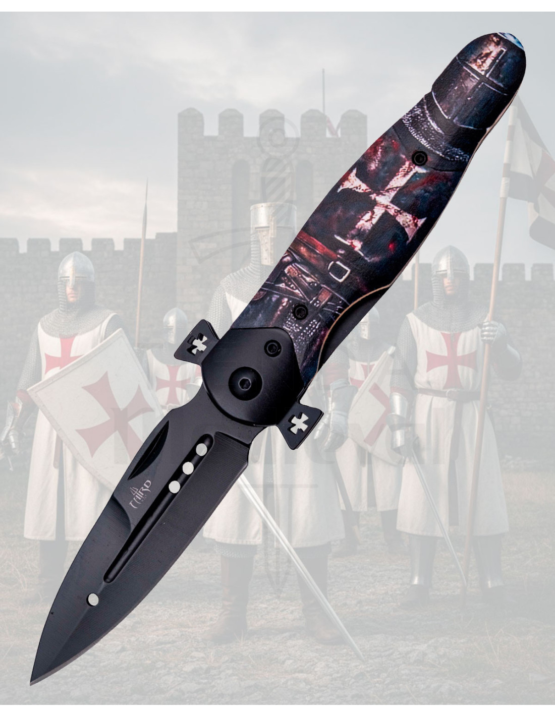 Le manche en bois de hêtre avec relief 3D recrée la figure d'un guerrier hospitalier, offrant une prise en main sécurisée et ergonomique, pensée pour que chaque manœuvre semble naturelle et contrôlée. Les détails dans des tons sombres et des contrastes de rouge et de gris ajoutent du caractère, en faisant une pièce qui ne passe pas inaperçue.
