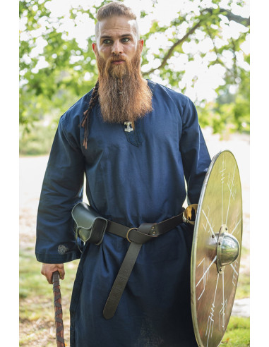 Soyez propriétaire d'une authentique robe viking et donnez vie à votre passion pour la culture viking ! Notre tunique Viking est fabriquée à partir de laine de haute qualité et présente un col côtelé brodé de nœuds Viking, lui donnant une touche d'authenticité et de sophistication. Ce vêtement est parfait pour être porté lors d'occasions spéciales, telles que des soirées à thème ou des événements culturels.