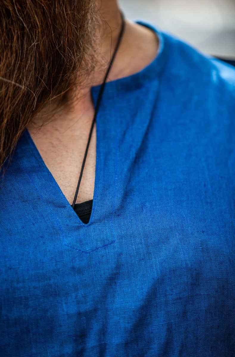 Cette tunique en lin bleu est un vêtement polyvalent, parfait pour les événements de GN, les marchés médiévaux, et aussi pour compléter une tenue nordique de tous les jours. Sa simplicité et son élégance intemporelle, sans fioritures ni détails élaborés, vous permettent de découvrir le monde viking dans le confort et sans compromis sur la sophistication.