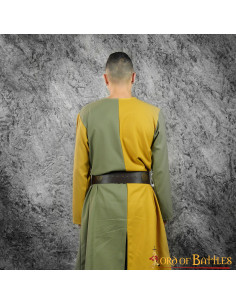Tabard médiéval bicolore olive-moutarde avec bouclier héraldique