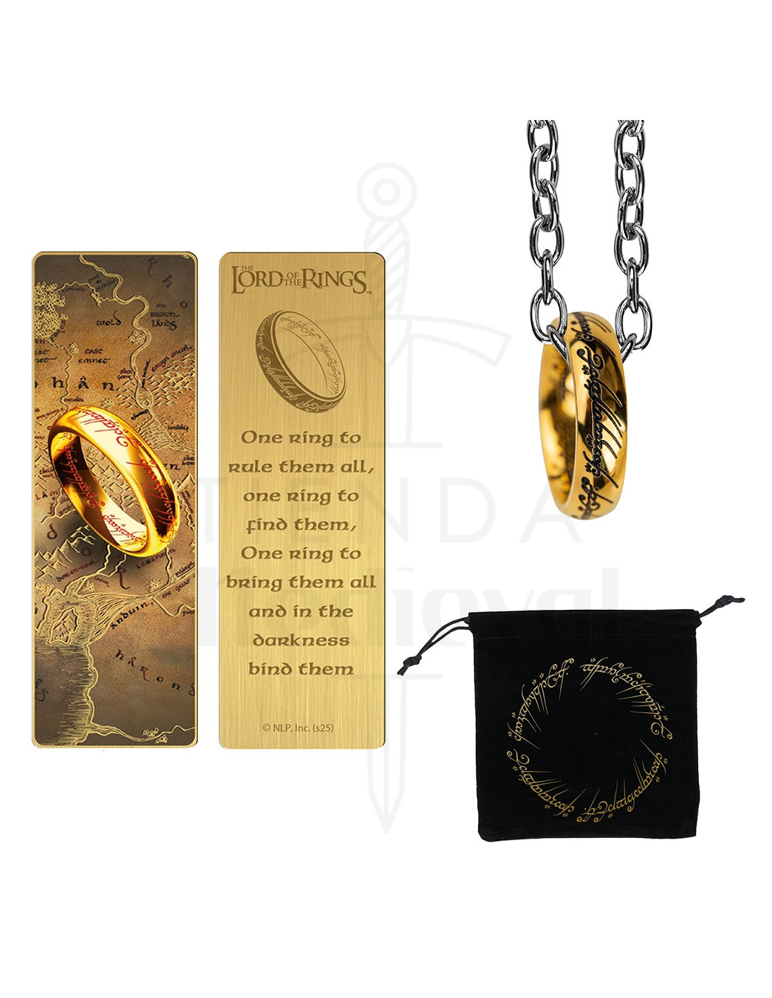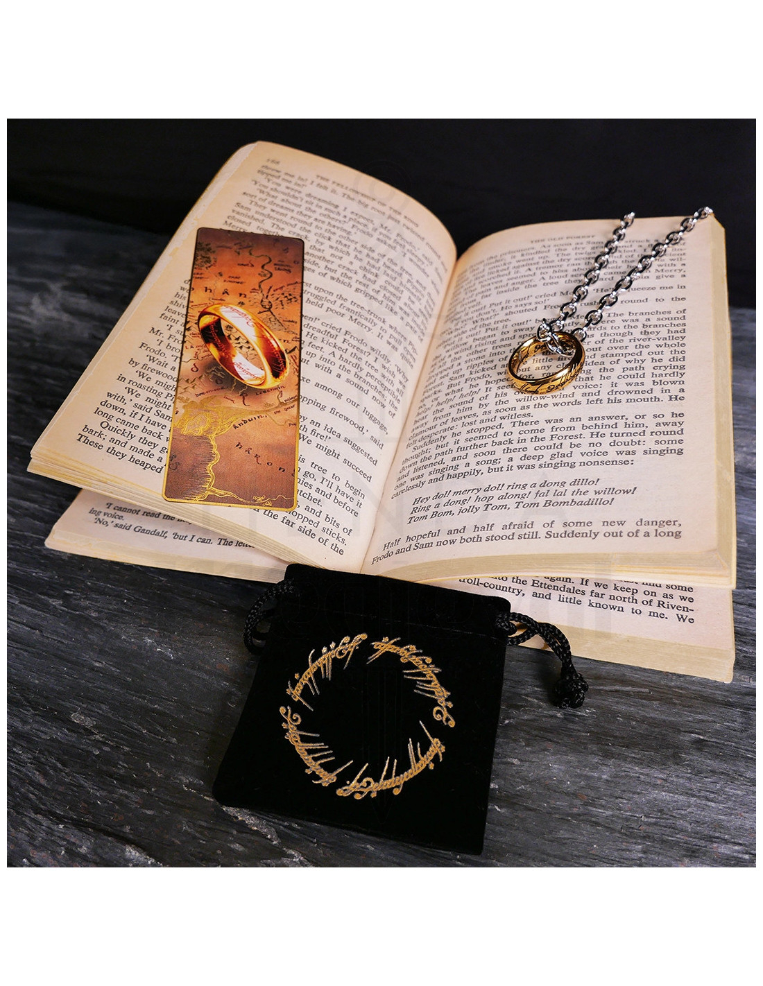 Ce pack combine une bague en métal gravée en relief et un marque-pages doré, présenté dans une petite pochette en velours noir avec fermeture à cordon et un motif circulaire doré, ainsi que deux cartes décoratives qui enrichissent l'expérience d'ouverture. La bague, montée sur une chaîne de maillons moyens, offre une finition brillante et résistante, conçue pour conserver son aspect même avec une utilisation quotidienne, tandis que le marque-pages métallique ajoute une touche élégante à vos lectures.