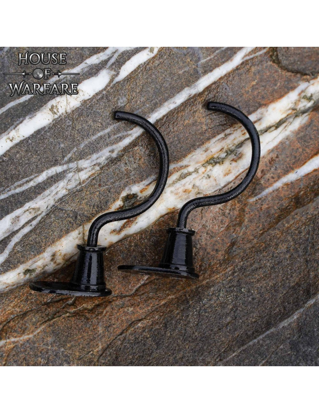 Ce paire de supports médiévaux offrent une solution prête à installer, pensée pour ceux qui recherchent une touche médiévale sans renoncer à la sécurité. La finition noire apporte discrétion et élégance, faisant que les pièces que vous suspendez se démarquent sans concurrencer la décoration. La courbe en forme de 'U' maintient les objets, évitant les glissements, et la base avec un trou de fixation garantit un montage stable sur des surfaces verticales.