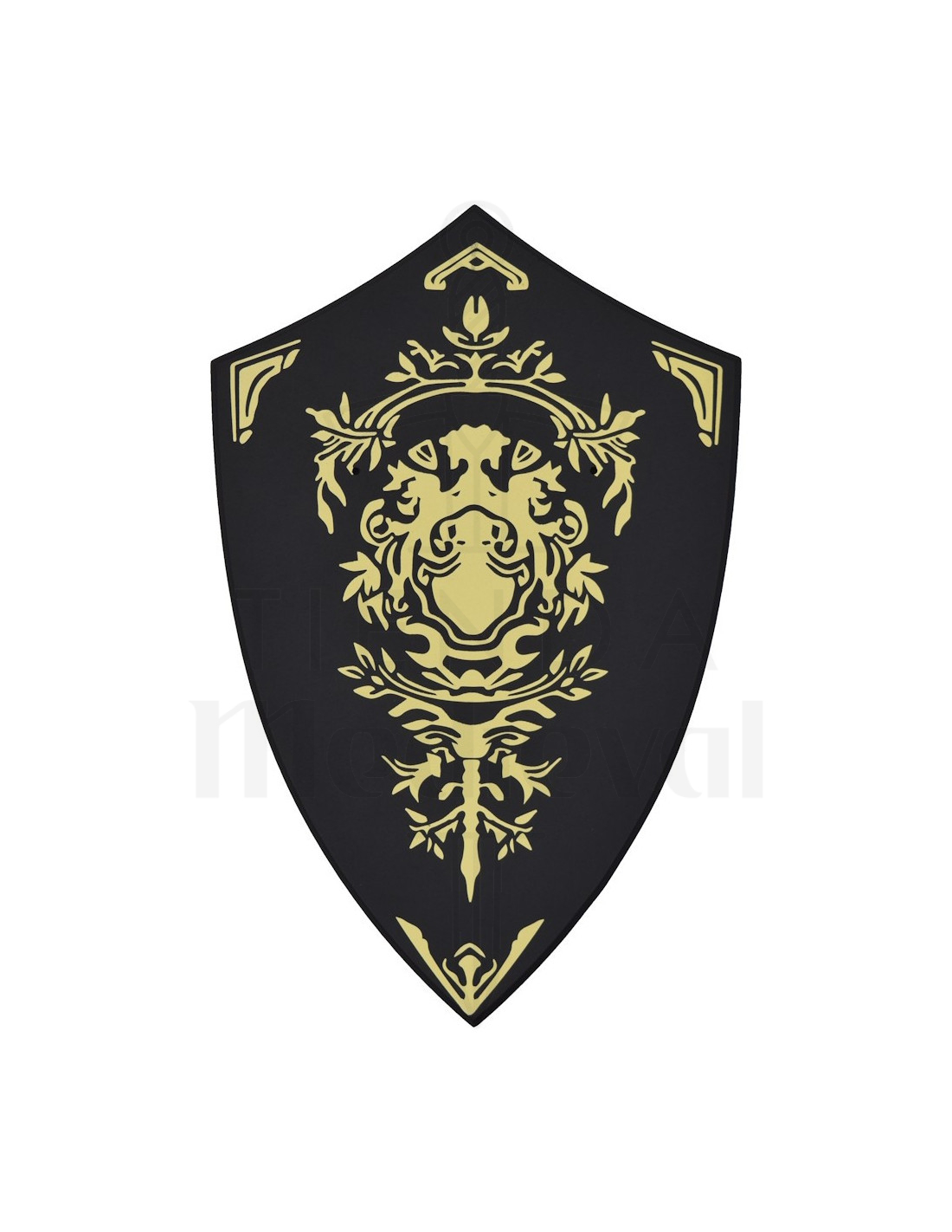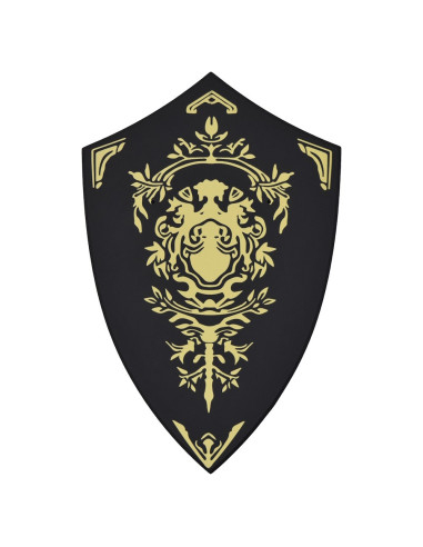 Le bouclier décoratif qui accompagne l'ensemble ajoute un point focal sophistiqué : sa base noire contraste avec un motif central et des bords dorés, avec un design symétrique rappelant des motifs floraux et héraldiques, pensé pour compléter le caractère épique de la pièce exposée. Ce contraste apporte de la profondeur et un aspect formel, idéal à montrer dans des salons, des bureaux ou des espaces thématiques.
