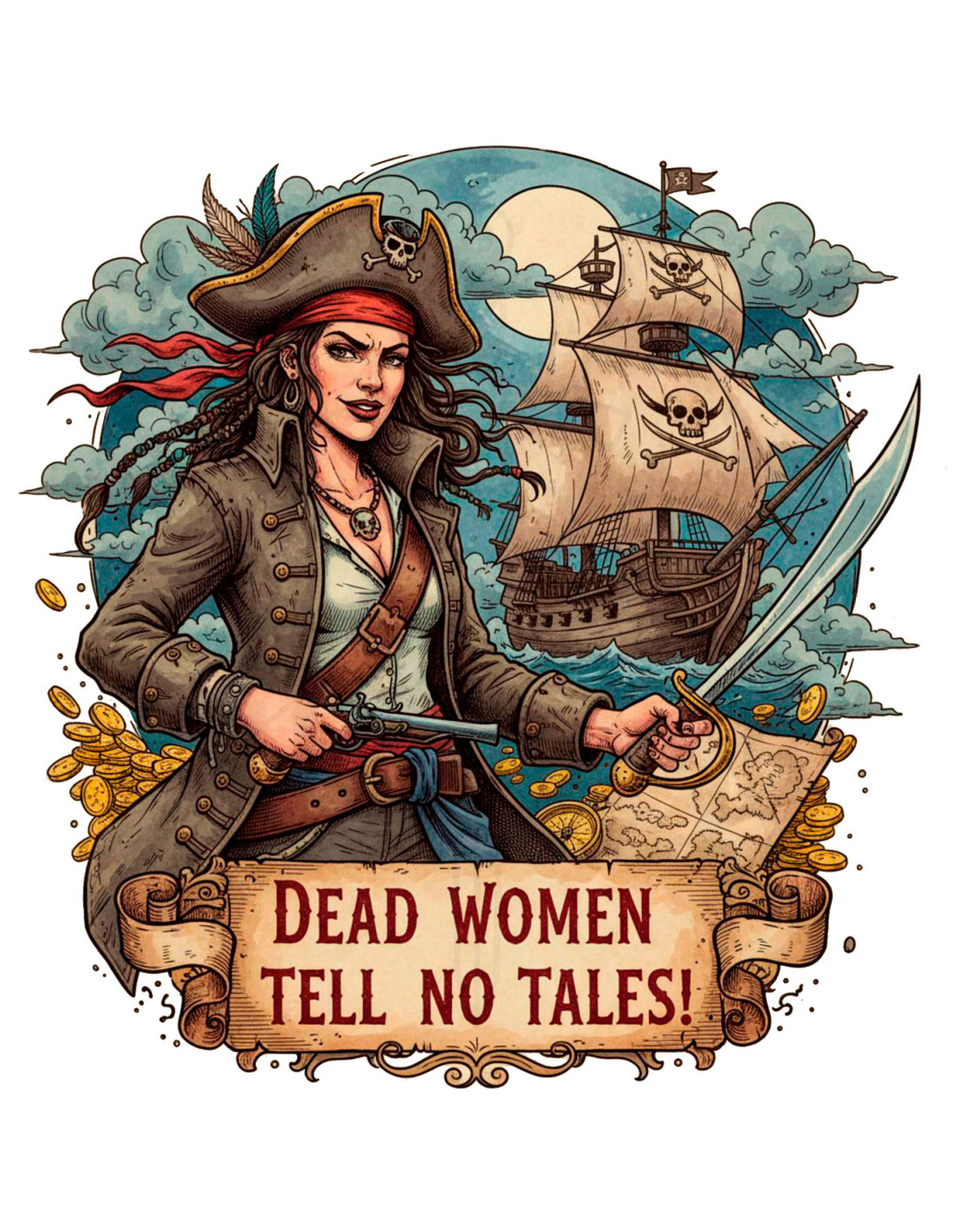 Vous cherchez cette pièce qui allie style et attitude rebelle ? Ce t-shirt noir de pirate pour femme avec la devise 'Dead Women tell no tales' est parfait pour celles qui souhaitent exprimer leur esprit audacieux et défiant. Confectionné en coton de haute qualité, son design en jersey 100 % coton garantit douceur et confort tout au long de la journée, quel que soit votre programme.