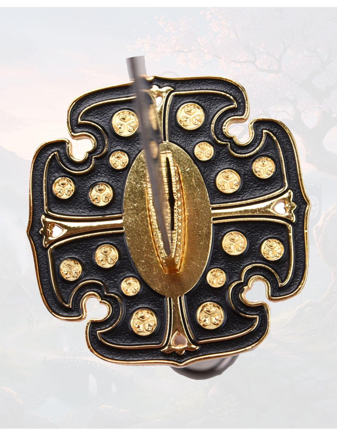 La garde dorée, avec son design perforé, et les ornements en noir et doré sur le fourreau, créent un contraste sophistiqué qui élève toute installation décorative. Le fourreau laqué noir, terminé par un tressage en blanc, noir et doré, ajoute une touche finale ornementale qui souligne l'inspiration classique et l'exclusivité de l'ensemble.