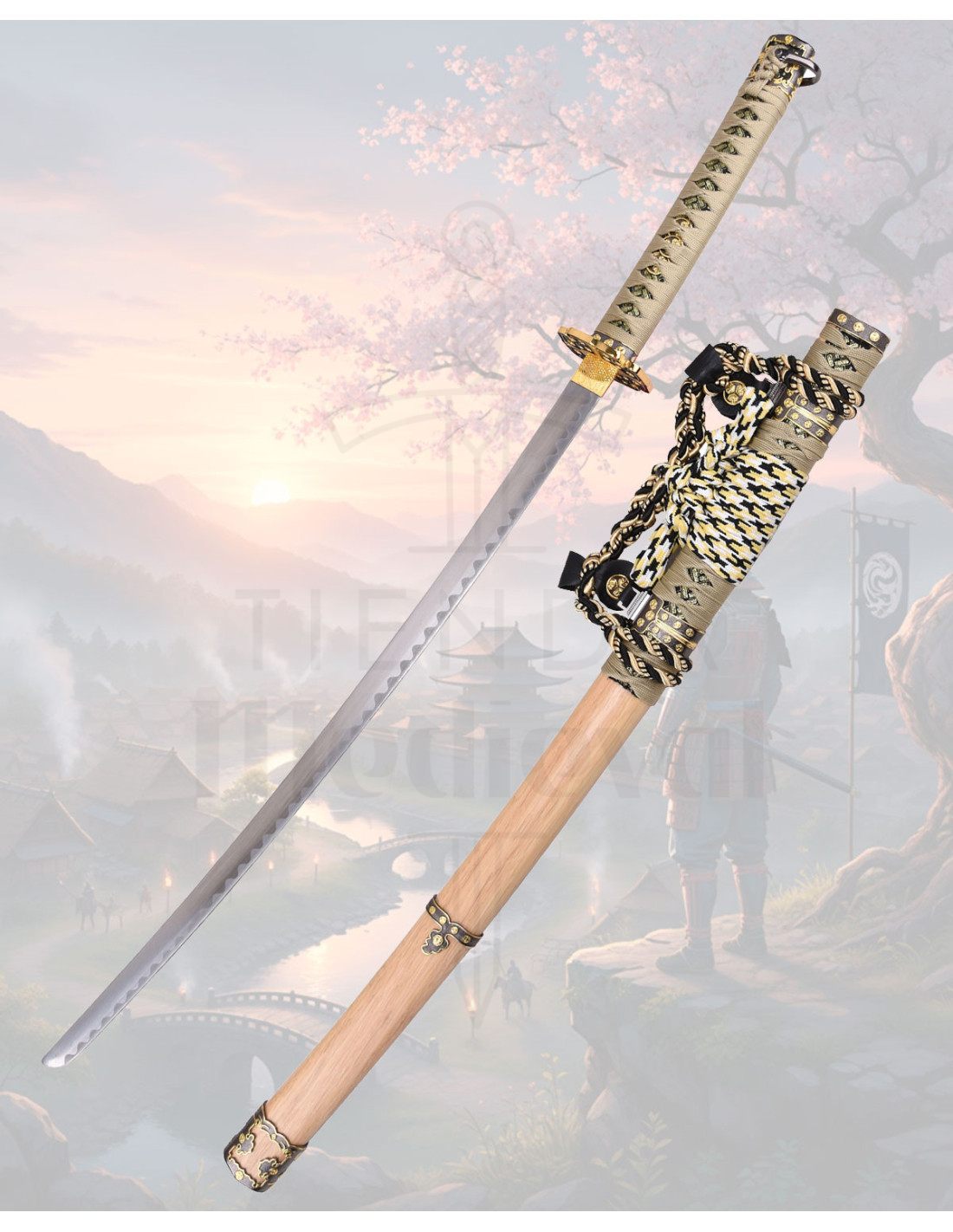Le manche, soigneusement cordé et décoré de tons beige, noir et doré, offre une prise qui transmet authenticité et confort à chaque manipulation, tandis que la garde circulaire dorée ajoute un point de distinction renforçant le style classique. La corde tressée en haut de la gaine non seulement rehausse le fini esthétique, mais permet également de la tenir ou de l'accrocher en toute sécurité, pensée pour ceux qui apprécient autant l'apparence que la praticité.