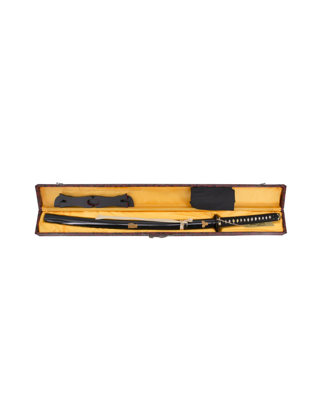 La katana comprend tout le nécessaire pour l'exposer et la mettre en valeur : un support de bureau, une housse de transport et une élégante boîte de présentation. Vous pourrez la montrer avec fierté dans votre collection ou dans votre coin préféré.