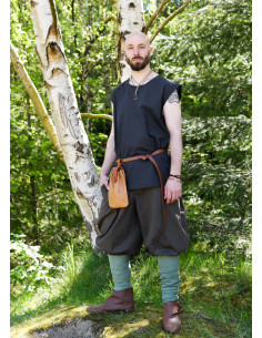 Le design simple de cette tunique s'inspire de découvertes archéologiques du haut et du bas Moyen Âge, reflétant fidèlement la mode de l'époque. Sa polyvalence vous permet de l'utiliser à la fois comme vêtement d'extérieur et d'intérieur. Lorsqu'elle est utilisée comme vêtement d'intérieur, elle protège vos vêtements extérieurs de la transpiration, et est donc également connue sous le nom de 'Leibhemd'. Elle est particulièrement recommandée comme vêtement intérieur pour les vêtements en laine, évitant que la laine ne gratte et ne cause d'inconfort sur la peau.
