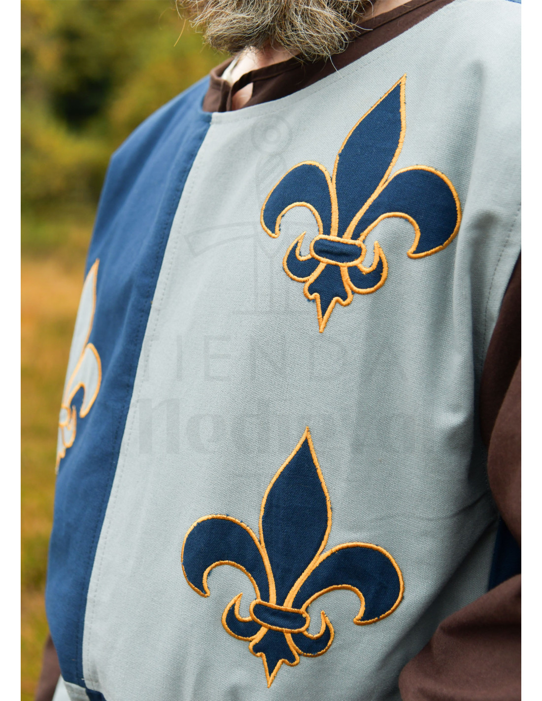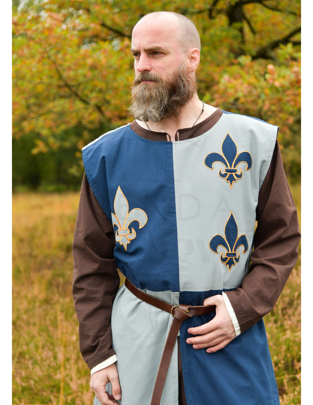 Tabard médiéval de chevalier avec motif Fleur de Lis, bleu