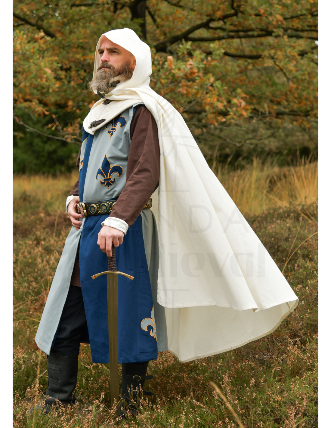 Le design MiParti, avec des blocs alternés en bleu foncé et beige clair, crée un contraste visuel puissant qui aide à vous distinguer dans la foule, tandis que les applications en Fleur de Lis en tons de bleu, beige et contours dorés apportent une touche d’authenticité et de présence héraldique. Visible des épaules jusqu’aux genoux, il offre une couverture suffisante pour des climats variables et pour recréer l’esthétique de combat sans renoncer au confort.