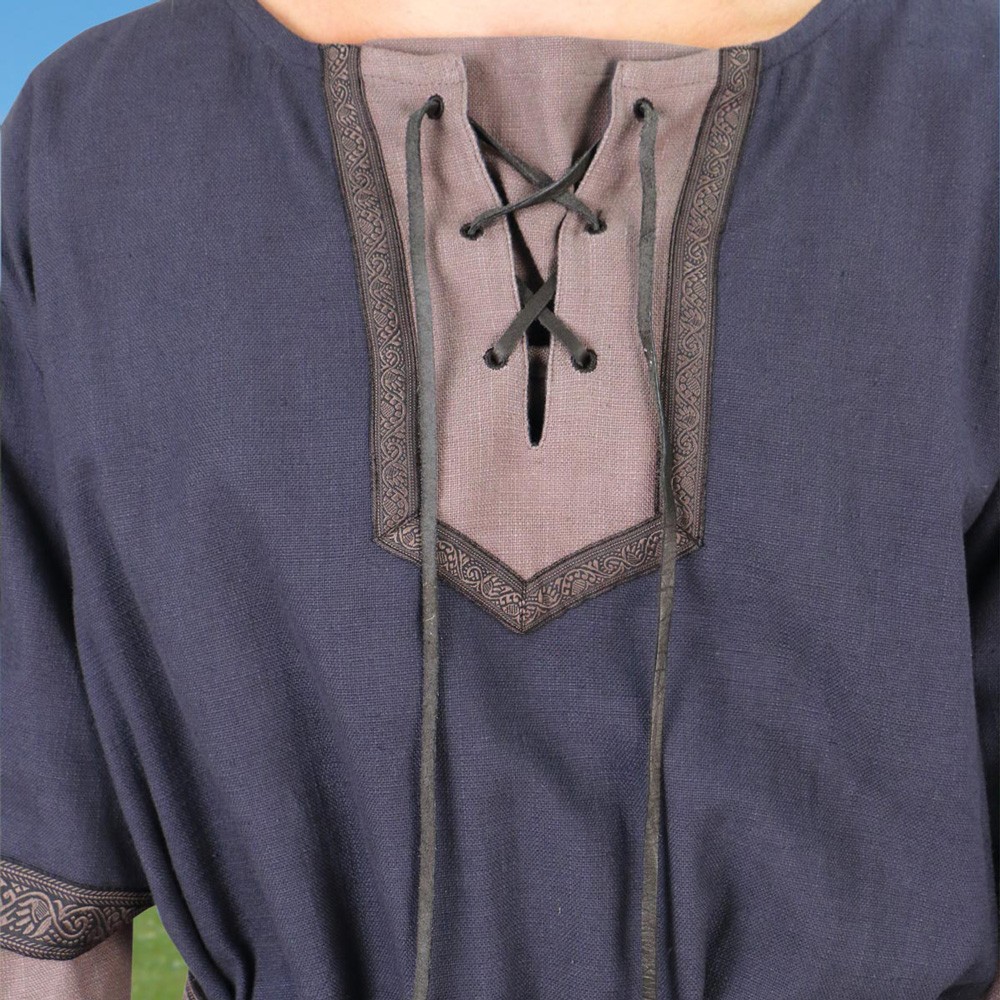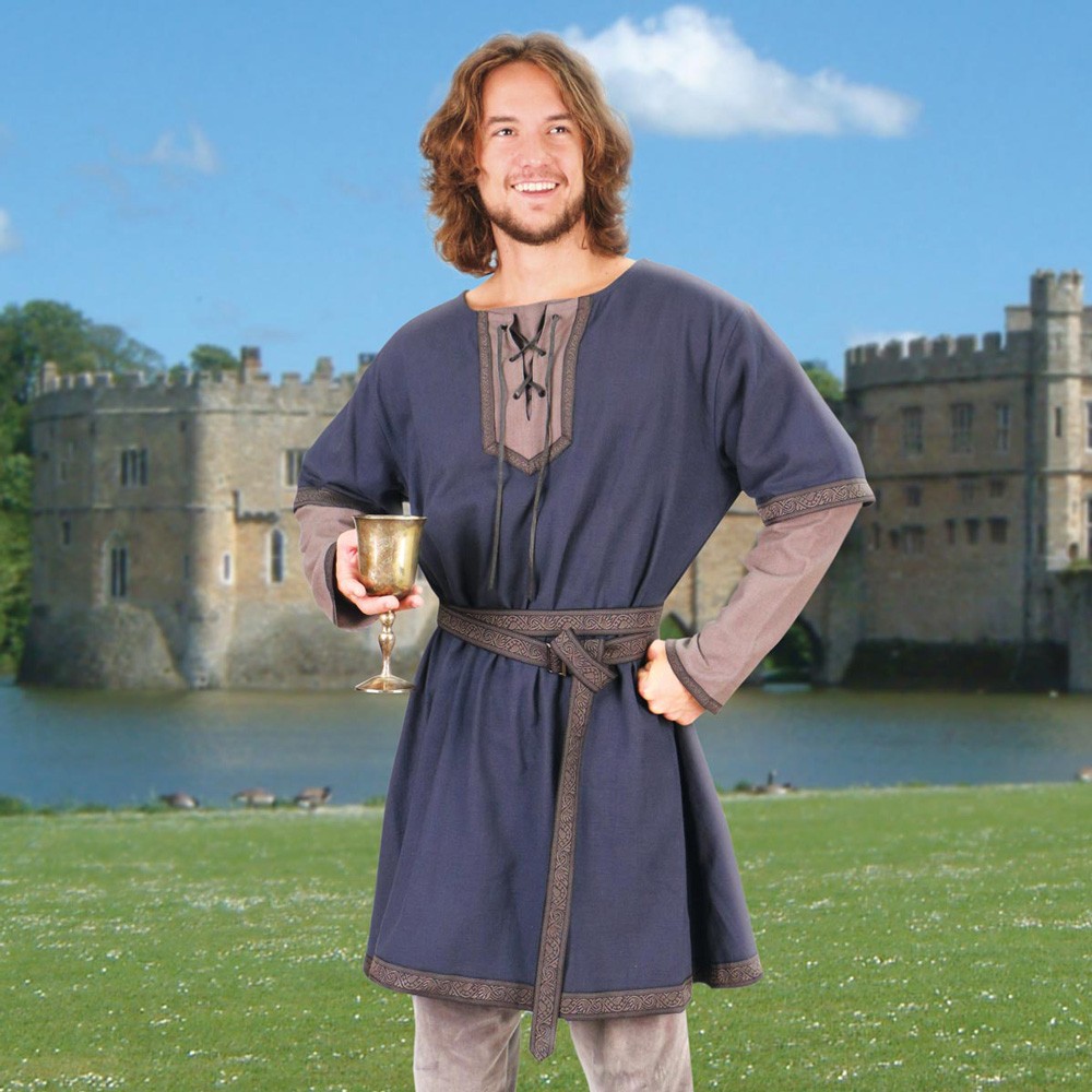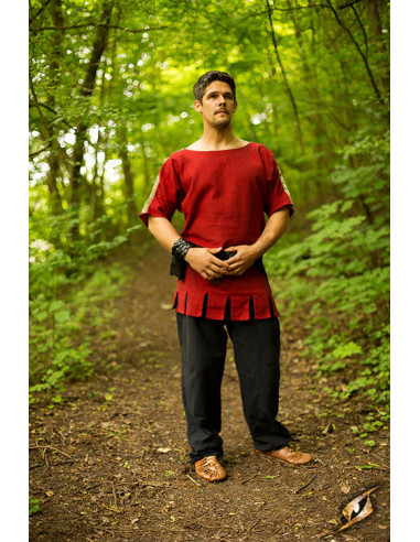 Imaginez porter dans votre look une pièce qui non seulement vous connecte à la noblesse médiévale, mais qui vous offre aussi la flexibilité d'afficher de la sophistication en toute circonstance. La tunique normande de courtisan, confectionnée en coton de haute qualité, vous permet de ressentir cette sensation de résistance et d'authenticité à chaque usage, sans craindre l'usure. Son design intelligent, simulant plusieurs vêtements en couches, vous confère un style imposant sans complication. Le détail du décolleté avec cordons, accompagné d'une broche cachée, garantit un ajustement confortable et sûr, vous permettant de vous sentir en contrôle total de votre présence. La bordure, avec un motif authentique, renforce cette impression d'appartenance à une histoire de guerriers et de courtisans.