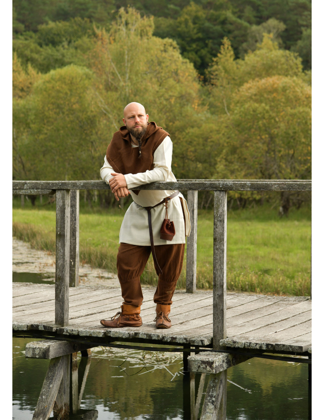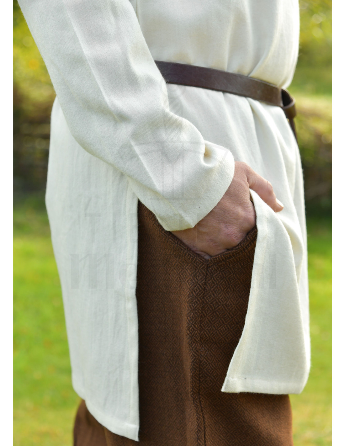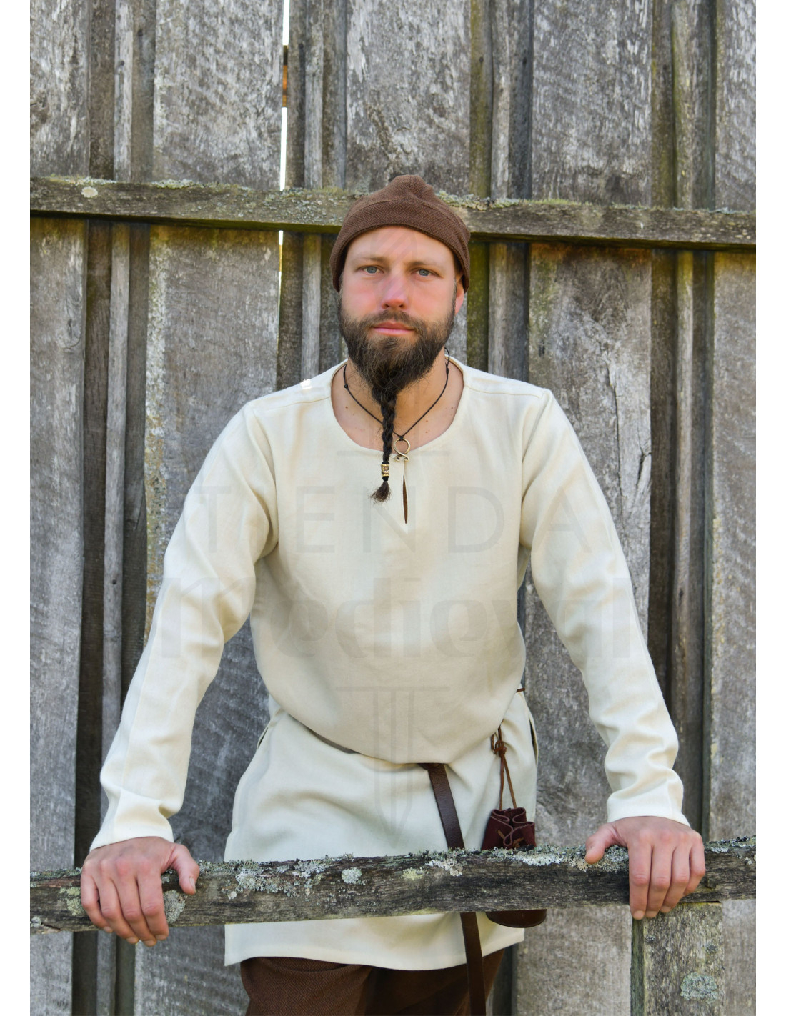 Son esthétique simple et la teinte ivoire clair visible sur l'image la rendent très polyvalente, parfaite pour être assortie à une ceinture en cuir foncé qui met en valeur la silhouette et ajoute une touche d'authenticité rustique. La texture naturelle visible dans le tissu transmet qualité et une présence discrète qui s'adapte à la fois sous des vêtements d'extérieur élaborés ou comme pièce principale lors de foires, de rencontres vikings ou de reconstitutions historiques.
