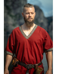 La Tunique viking courte modèle Loki, rouge vous offre cela, et bien plus encore : un design pensé pour que vous puissiez vous déplacer librement, garder le confort durant des heures et arborer une finition avec du caractère. Les manches courtes et le décolleté en V facilitent la ventilation et permettent de superposer sans perdre le style, tandis que les bordures décoratives ajoutent un détail visible qui élève n'importe quelle tenue.